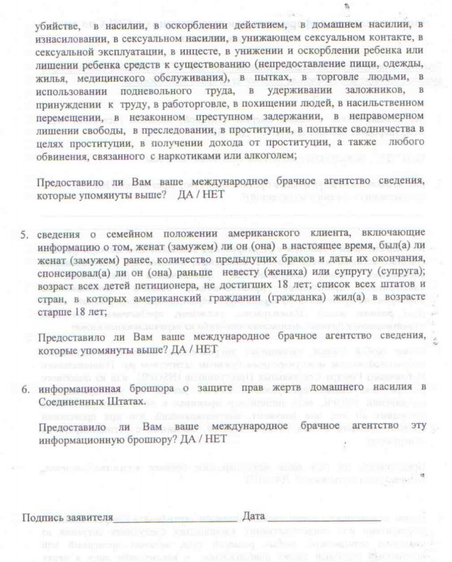 Там они указали несколько вопросов на тему "Давало ли вам международное брачное агентство доки, подтверждающие несудимость и отсутствие сексуальных правонарушений со стороны жениха и т.д..."