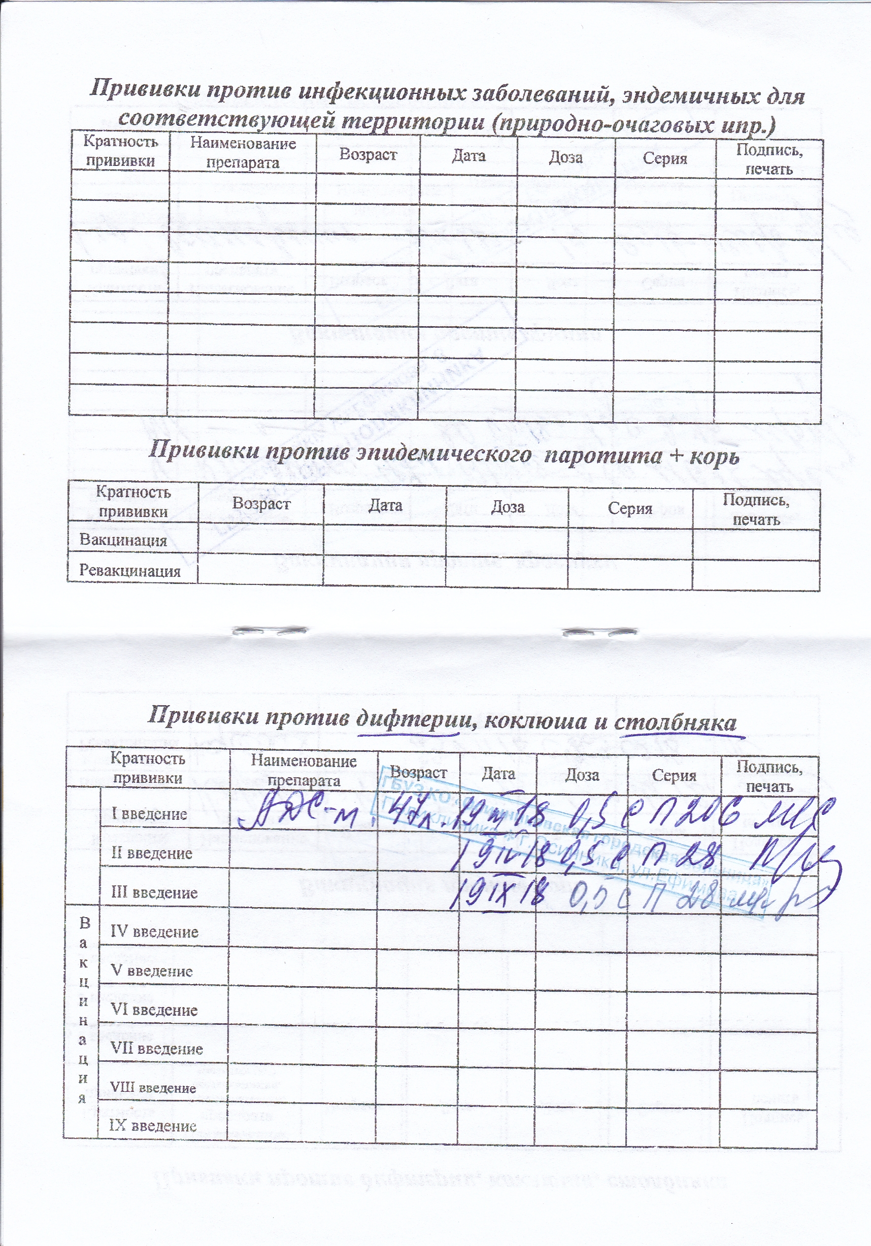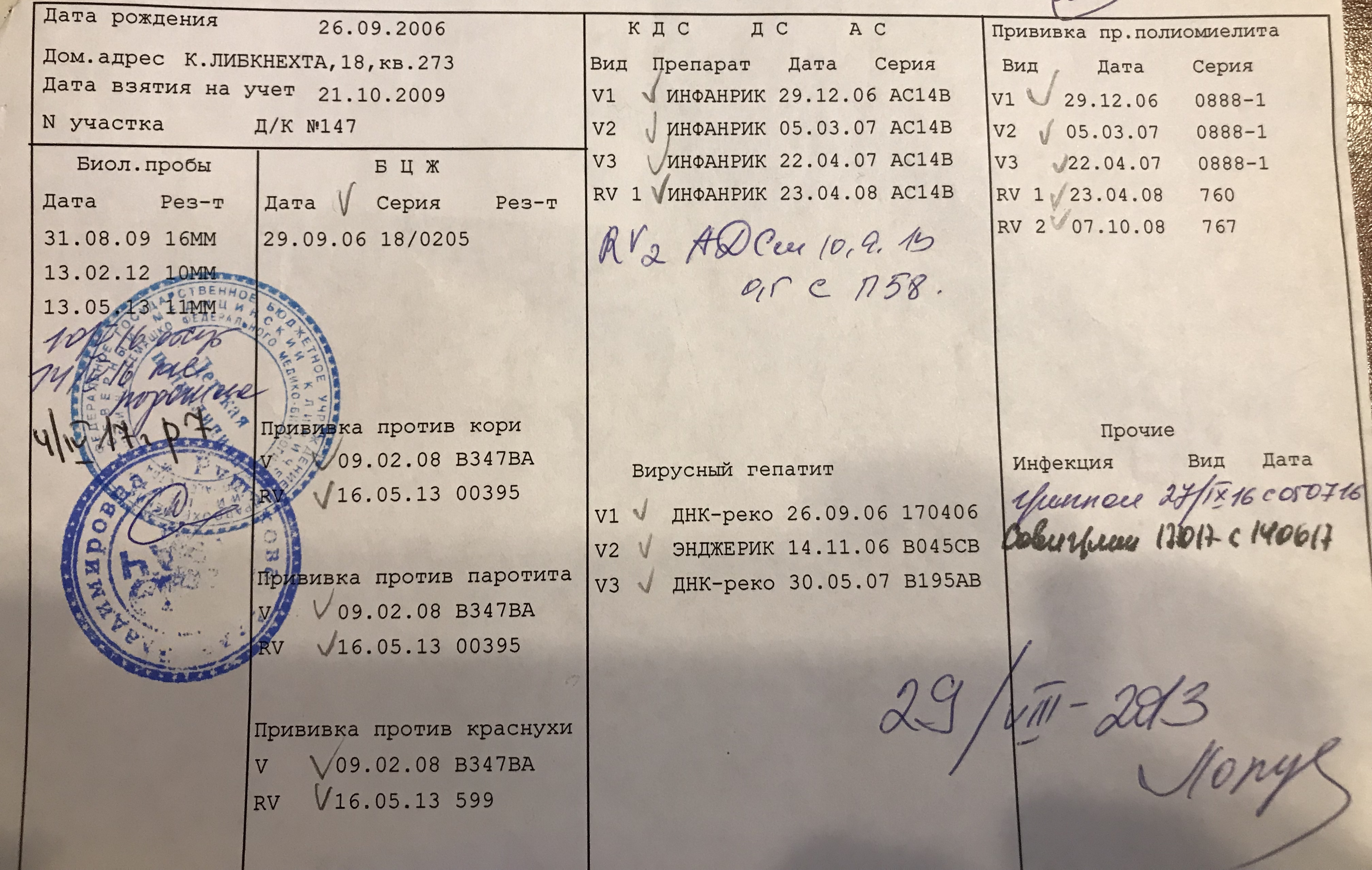 alla144 писал(а): alla144 писал(а): instructor писал(а): последняя дата АДСМ? 10.09.2013? а справка выдана августом 2013-го? проясните этот вопрос. А так - всё есть. Только грипп нужен. Справку мы получили в мае 2018, когда забирали мед.карту с прежнего места жительства в другом городе. Сегодня ходили в мед.центр к педиатру, показывали эту справку(учетную карточку) о прививках. Да, АДСМ сделана 10.09.13. Спросили, можно ли сделать сейчас, и получили ответ, что нельзя, т.к. существует Календарь прививок, где АДСМ по срокам в 14 лет. А девочке сейчас 12 лет и 1 мес. Т.е. нам нужен только грипп? Последняя проба Манту 7 мм, сделана в апреле 2017. Собираемся сделать ее недели через 3. Пропустили сроки в связи с переездом и пр. Не отразится ли это на тесте IGRA? Спасибо, Мария P.S. Я даже не обратила внимания на эти даты, там в справке есть ещё прививки за 2016 и 2017 год. Лучше переделать? грипп - сделать. Манту - не делать(мы IGRA вам запишем для отчетности). справку - переделать