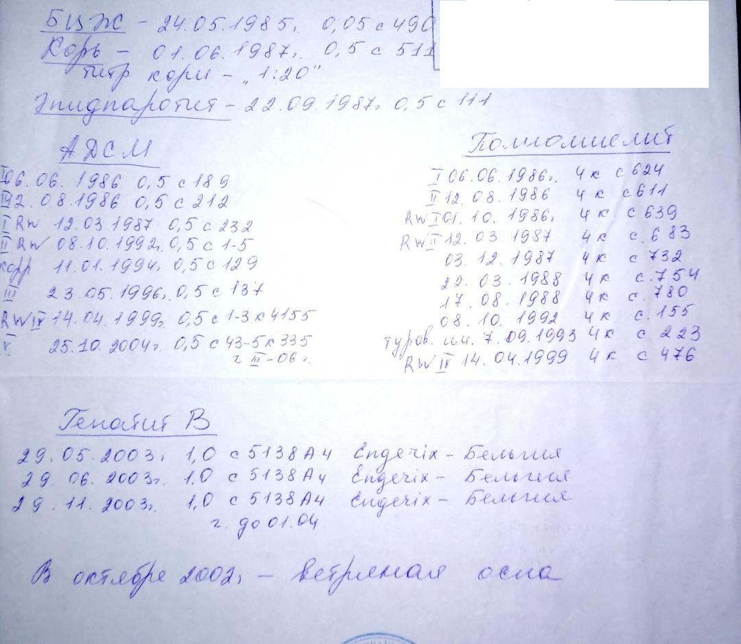 Добрый день, меня интересует вот такой вопрос: моя детская карта была утеряна, и все прививки были переписаны со школьной мед.карты во взрослую, я хотела взять свою мед.карту в МОМ как доказательство, что у меня проставлены прививки, но врач отказала, якобы это документ поликлиники и на руки не отдают больше. Поэтому я попросила хотя бы выписать мне их и заверить печатью Она выписала всё на обычный листок, фото приложила. Вопрос, примут ли у меня эти прививки? и посмотрите пожалуйста вдруг чего-либо не хватает. заранее большое спасибо