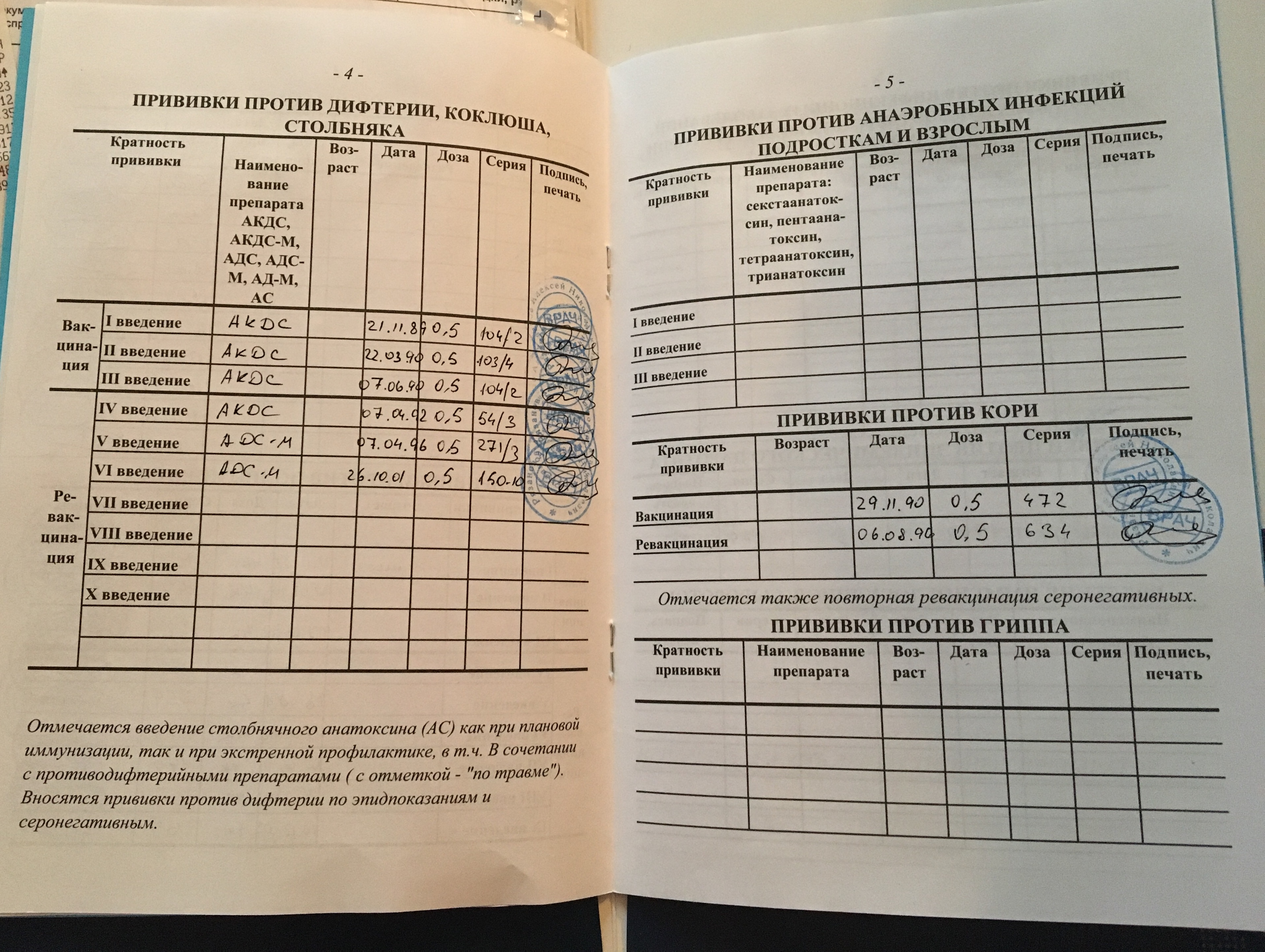 Уважаемый инструктор, В клинике перенесли мои прививки в сертификат адекватного образца, пытаюсь теперь понять чего не хватает и что необходимо будет доставить. Ориентировочно в МОМ попаду в конце ноября - начале декабря. Есть несколько вопросов: 1. Столбняк/ дифтерия (АДС-М). Свежей прививки нет, которая была бы сделала в течении последних 10 лет. Можно ли сделать сейчас т.к. срок её действия 10 лет, а то всё на последний момент оставлять не хочется. Или необходимо делать прямо перед походом в МОМ? И достаточно будет одной вакцины или необходимо более одной? 2.Корь/паротит/краснуха. Судя по отметкам в прививочном сертификаты эти прививки проставлялись отдельно. Корь - 2 шт (90, 96 год), паротит - 1шт (92 год), краснуха - 1шт (2002 г.). Нужно ли их еще доставлять? Если да, то какие и сколько штук? И так же вопрос - ставить ли их можно заранее сейчас или прямо перед походом в МОМ? Буду Вам очень признательна за помощь!