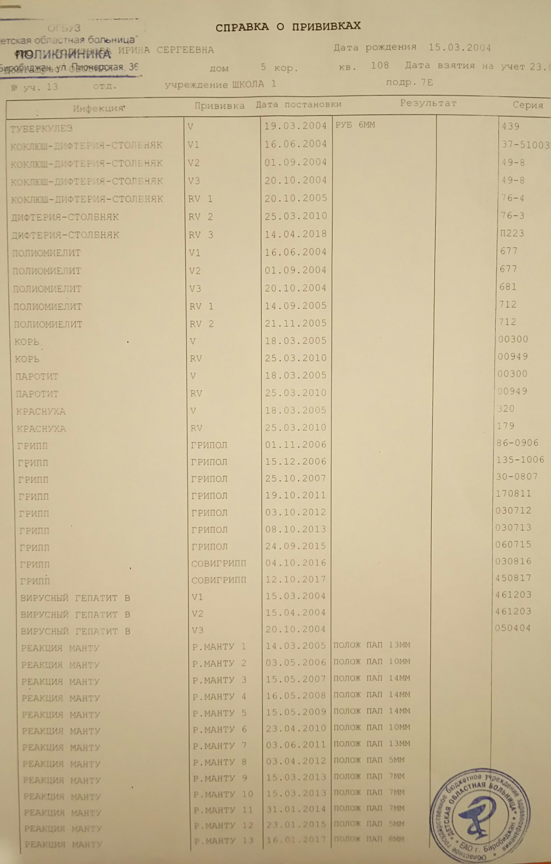 Здравствуйте уважаемый Инструктор! Вот и настало моё время получить Вашу помощь. Посмотрите, пожалуйста, справку о прививках (2 стр), ребёнок 14 лет. Вопрос: 1 Все ли необходимые прививки в наличии? 2 Вы примете эту справку прививок? Сертификат прививок и карточку из детской поликлиники тоже привезём. Буду благодарна за ответы. О себе задам вопросы позже.
