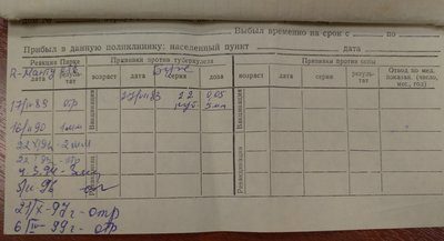 Прилагаю фото своей детской медицинской карты (я так понимаю, она заводилась при зачислении в школу, год рождения - 1983). Возможно, какая-то информация будет дублироваться на страницах.