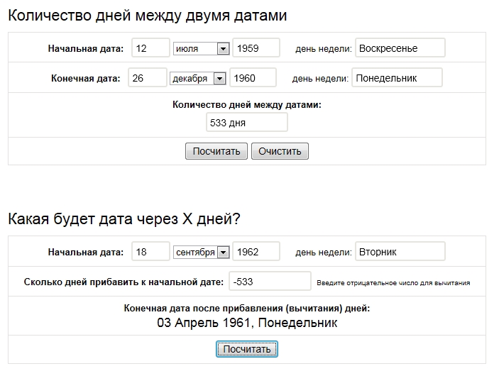 О списках прививок... Я не могла найти прививки для 1959 г. рождения... Девушка с нашего форума прислала мне за 1960 год (этот список прошел проверку!)... Я долго не могла пересчитать его под мою дату - ленилась я!... Сейчас все даты пересчитала за 10 минут!!!... Нашла хороший калькулятор-онлайн... В верхней его части посчитала разницу в дня между датами рождения, а потом - дело техники!... В нижней части ввожу дату из списка девушки, минусую дни разницы (если нужно уменьшать, то писать со знаком "минус") - один раз вписала дни разницы и все - меняю только даты прививок по списку... Очень удобно - показывает не только дату, но и день недели того года, который нужно писать (потому есть возможность сдвинуть на будний день)... Даже нашлась "ошибочка" в том списке, который прошел проверку - там есть дата 31 ноября (и не заметили никто!...  )... Так что, девочки, если есть выложенный на форуме подходящий для вас список - пересчитаете по себя быстро и легко!!!... Буду рада если кому-то пригодится эта ссылочка... Удачи!... http://calcsoft.ru/calculator-dney