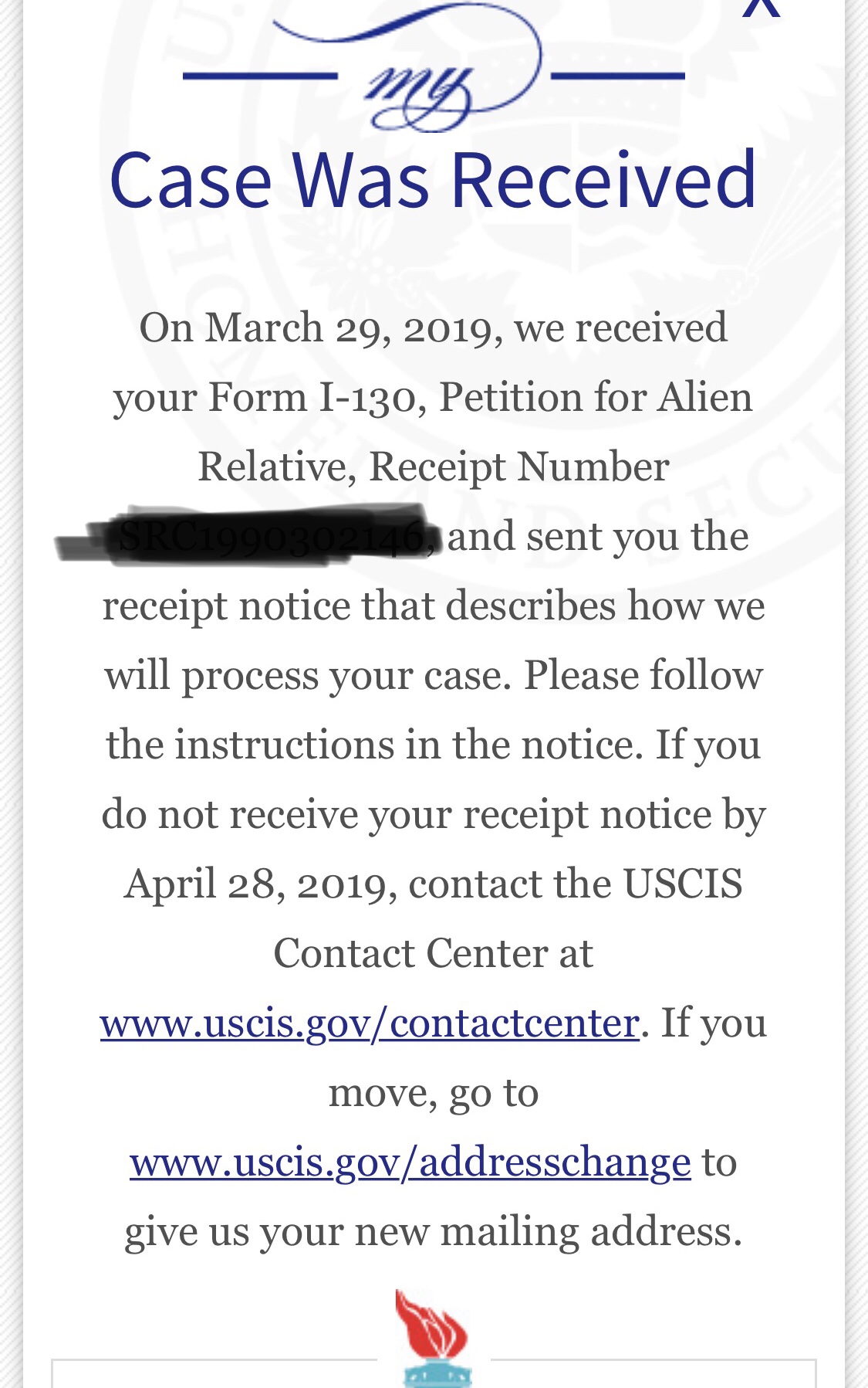 Mila-0313 писал(а): Добрый день! В начале марта подали документы на визу CR-1. На сайте по номеру видим информацию, что форма I-130 получена 29 марта 2019 и до настоящего времени, больше никаких изменений. Кто в процессе получения такой же Визы, ребята как у вас? Это нормально по срокам? Какие наши следующие действия ? (NY-Moscow) Мы подали 15 декабря. Получили одобренную I-130 15 марта. Подавали через Potomac Service Center. Если через 180 дней, после получения ими ваших бумаг, не будет ответа- надо им звонить.  И просить к телефону супервайзера, у них больше доступа. Это если воссоединяется супрг/а гражданина Америки. После одобрения I-130, ваш кейс отправят в Визовый Центр и все инструкции от них, будут приходить на Ваш имейл. Мы сейчас ждем назначения даты интервью. Удачи.