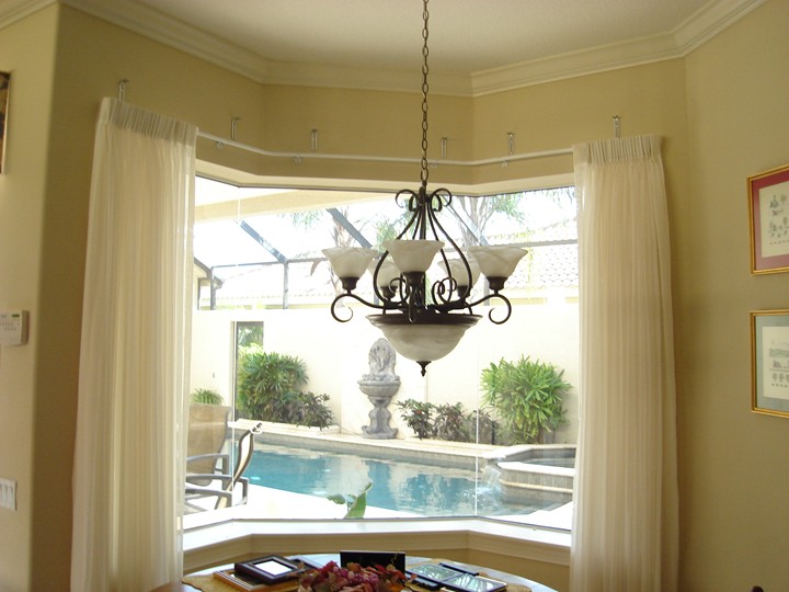 Joan_Goodman писал(а): Alen-ka писал(а): Как называются такие карнизы? У нас в спальне и в зале 3 окна вместе. Если вешать карнизы все 3 по отдельности, то надо резать тюли. Так этого делать не хочется....жалко, дорогие тюли.... Да у меня такие же бей виндоус в ливинг рум. Тоже голову ломаю. У нас в спальне бей виндоус полукругом, по сторонам обрамлены полосами ткани от пола до потолка, а на самих окнах roman shades.В фемели рум тоже как бей винд-с, но там стена по прямой, а часть стены со средним окном углублена под телевизор. Я присмотрела идейку, но телевизор мешается, да плюс еще стена рядом сплошь стекло с блайндс. Ну и в брекфаст нук незадача - аквариум виндоу, утром в него солнце со всей дури светит, а когда еще дома в том направлении построят, так по вечерам придется от соседей закрываться. Вот нашла вариант, так он чет какой-то... никакой, такое впечатление, что сверху еще бы что-то добавить