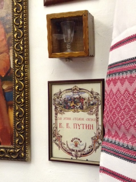 Вечером ходили всей семьёй в Украинский ресторан "Тарас Бульба" Пригляделись, и вот что на стене у нашего столика увидели. Во Как! И даже рюмочка в рамочке...