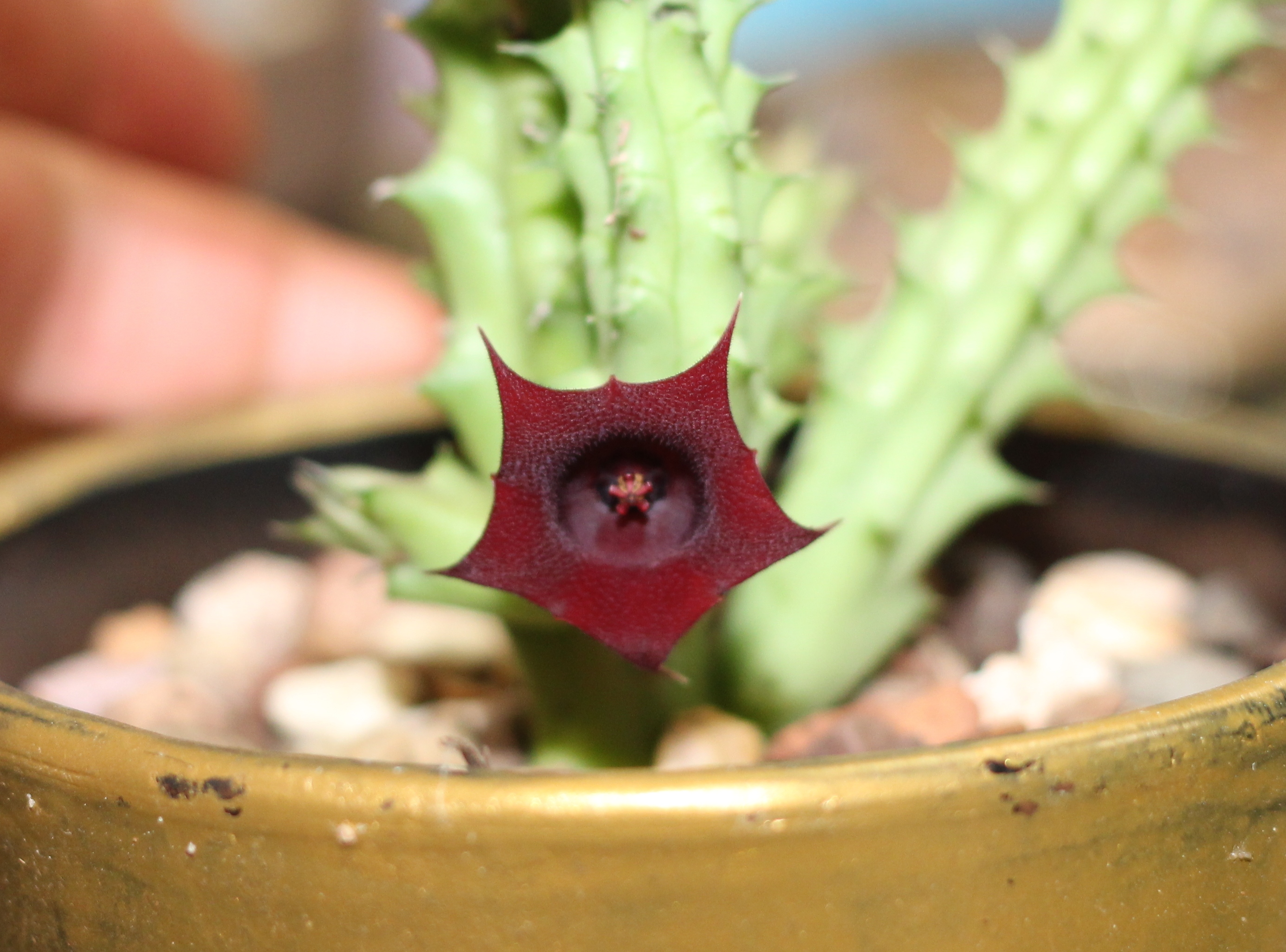 Сезон фаликов набирает обороты Поздравляю всех с новенькими красавишнами каждый день иду искать стрелки, и ни одной новой пока. Старые тоже особых движений не производят. ТОже надо попересаживать часть...за несколько лет уже кора превращается в плодородный, но неправильный грунт. Где пемзу покупаете, товарищи? должно быть на века!  раз посадил забыл. Всего-то цветут сейчас фиалка (адын) и - бабам! - неожиданно на крошечной стапелии обнаружился цветок. К счастью, не из вонючих.