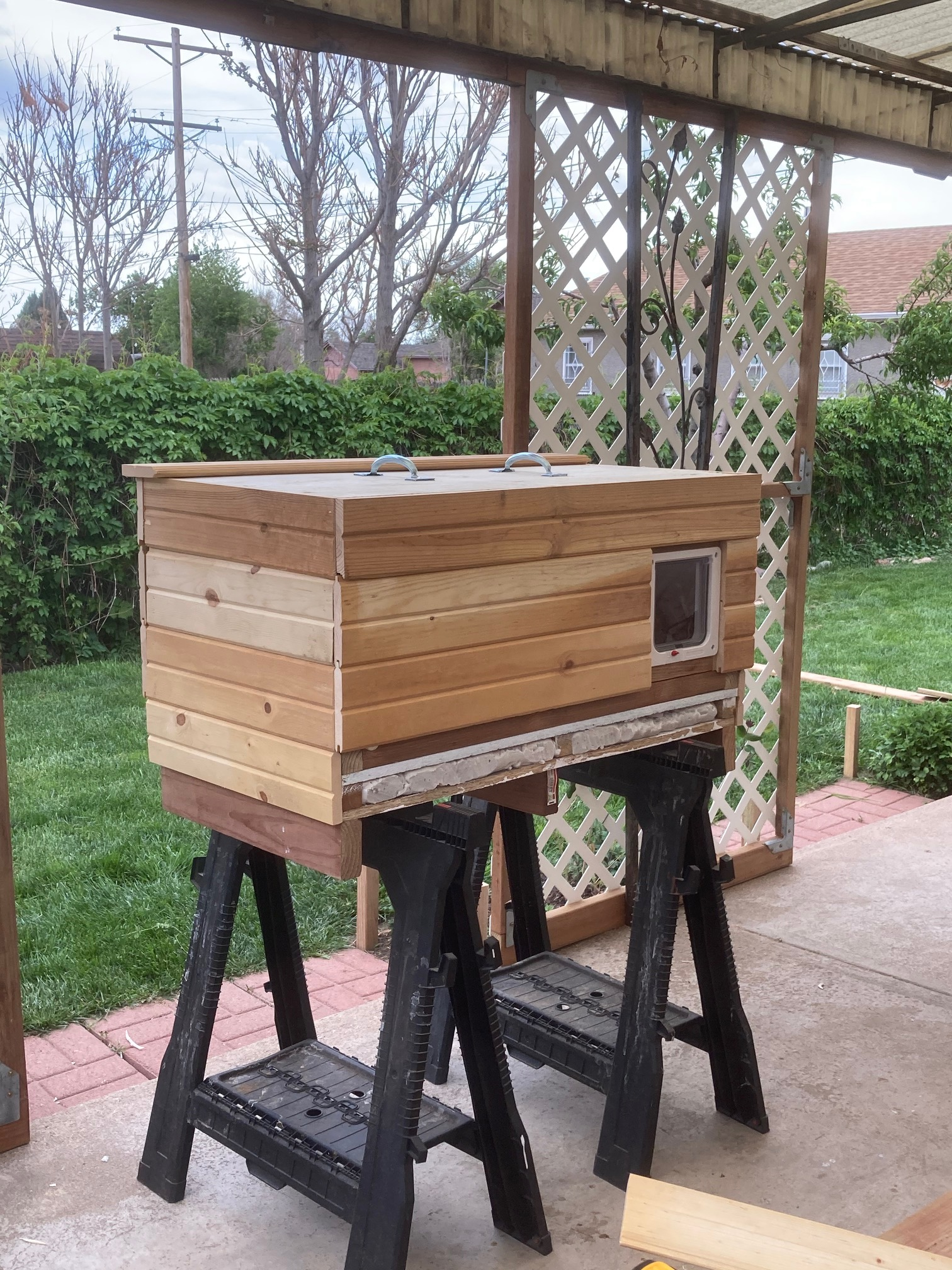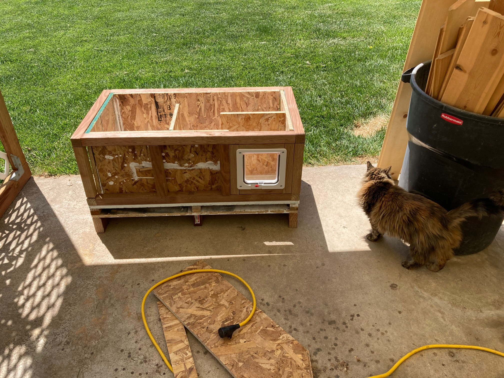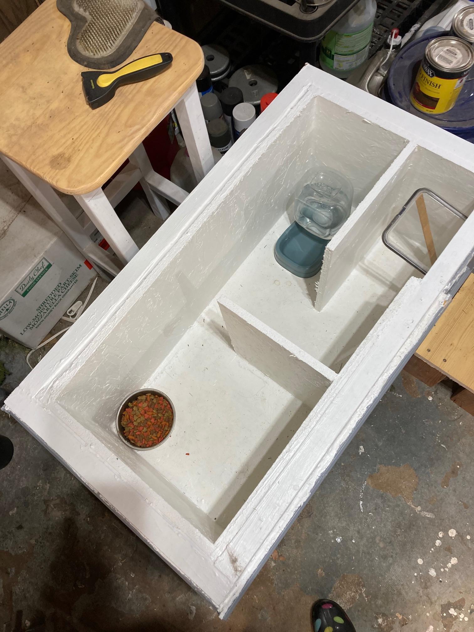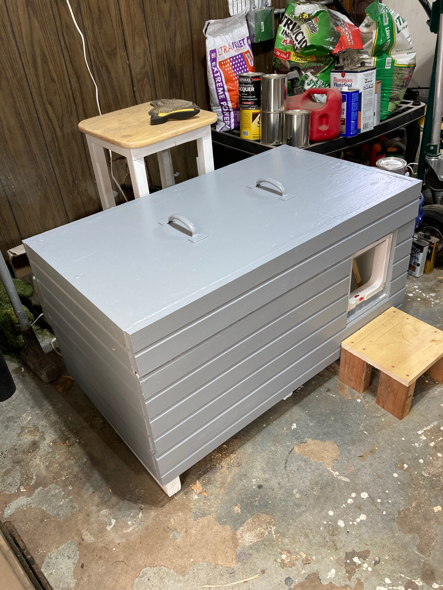 финальный вариант - после покраски - сохнет в гараже. После домик был вынесен на улицу, внутрь было положено одеялко и электрическая подстилка (на зиму).