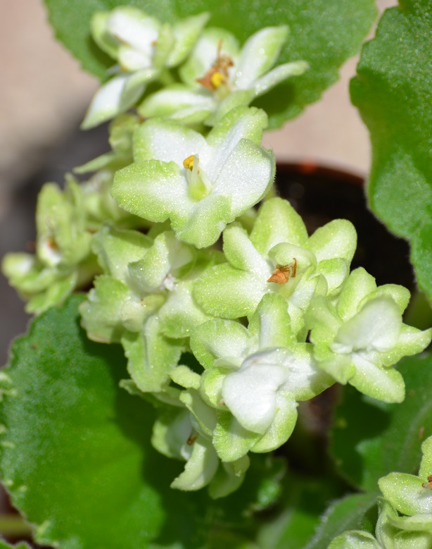 Фиалки тоже цветут периодически, правда давно уже нуждаются в подкормке. Вот необычная зеленая сейчас цветет, сорт "Frozen in Time". У нее листочки еще должны быть с ярковыраженной белой окантовкой, но у моей ее почти нет.