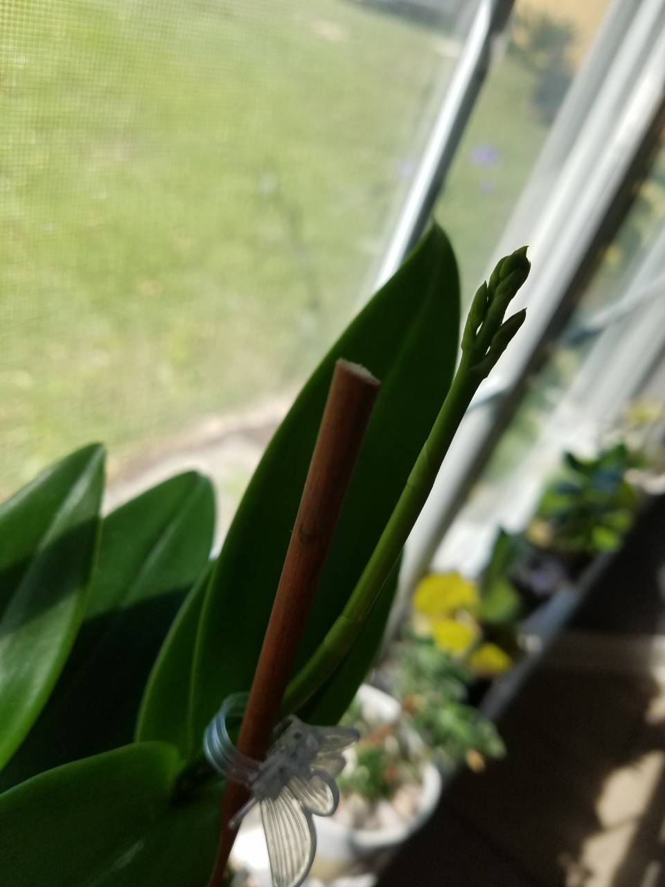 Теперь о дендробиумах... Росток, который по весне проклюнулся, вымахал выше материнского растения (на нижнем фото). Но маман тоже не отстает... выдала цветоносик
