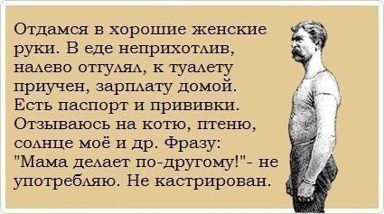 Glebz писал(а): Муж придя с работы спрашивает у жены: — Ну, как дела моя сладкая! ? Она: — Все хорошо, дорогой! Борщ сварила, котлеток нажарила! Окошки протерла, детские вещи все перестирала. Вот сижу носочки вяжу... А завтра, если снова забудешь заплатить за интернет, я тебя УБЬЮ !
