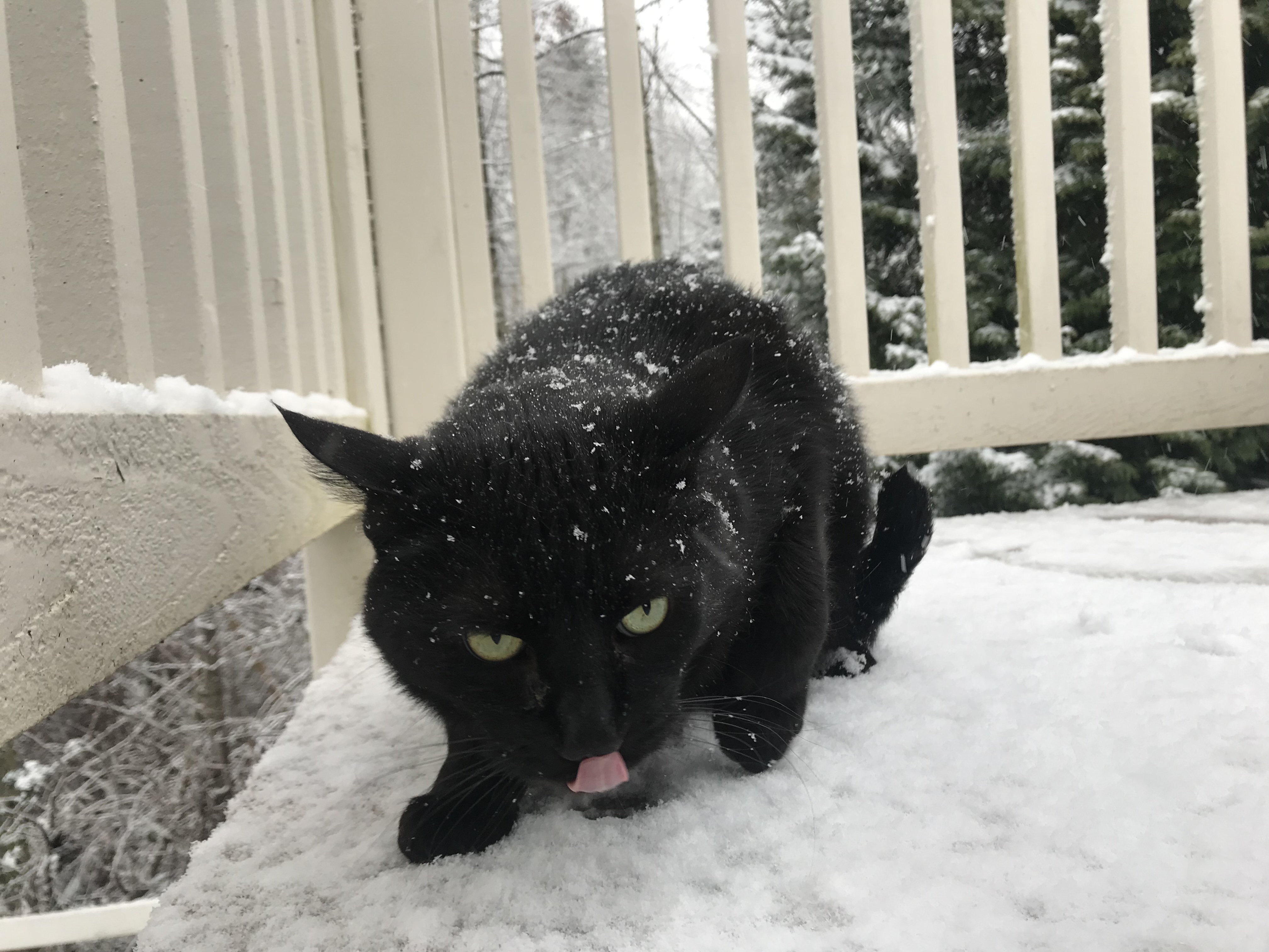 Добрался наконец то этот шторм и до нас, до северозапада. Пошел снег. Обещают два иначе. Это первый снег этой зимой. Кошка на террасе охреневает