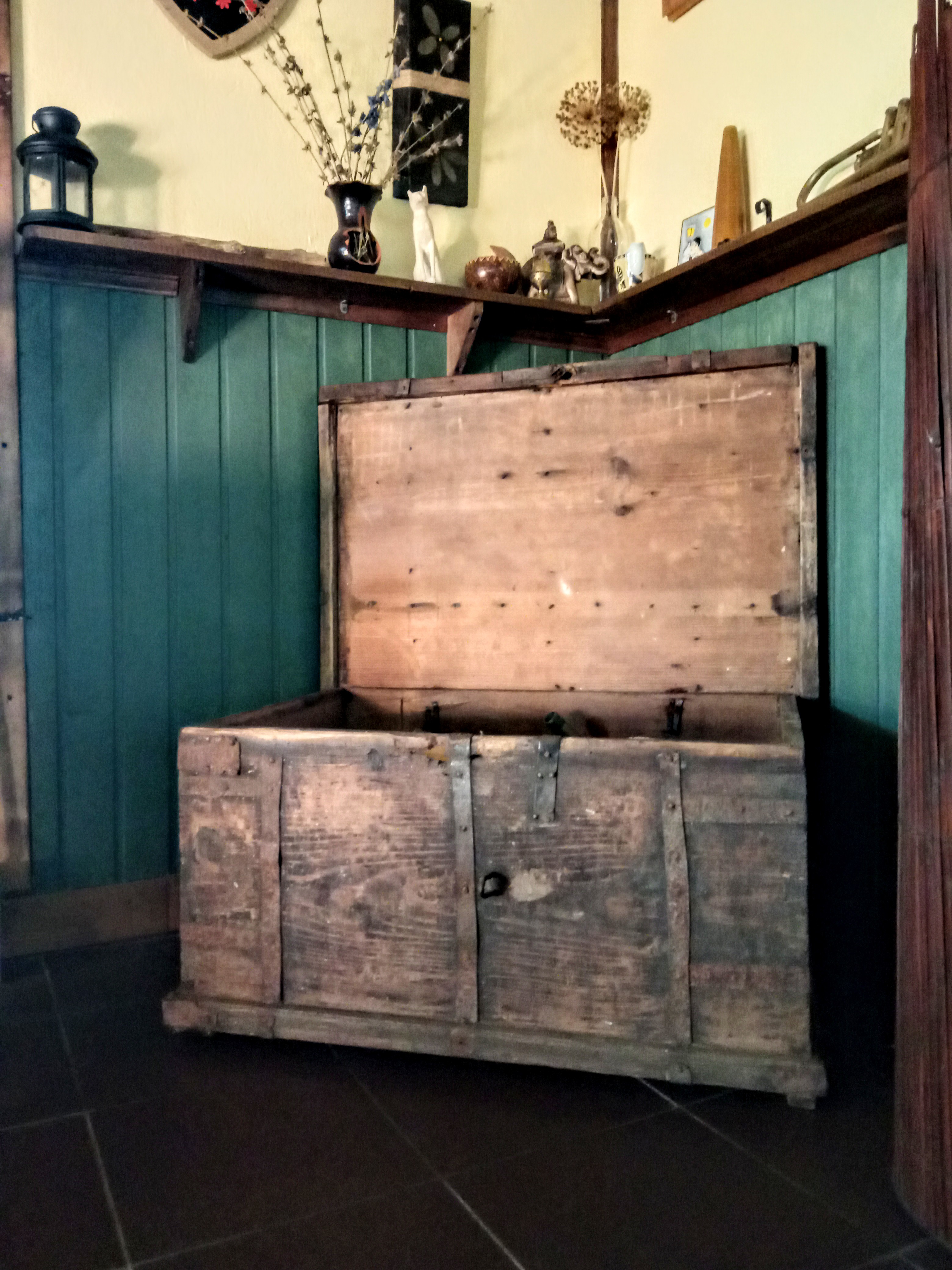 Разжилась старым старым сундуком. Даже не стала его подшаманивать, и так прекрасен. С деревни сосед отдал. Огромный, с железными ручками. Прям класс