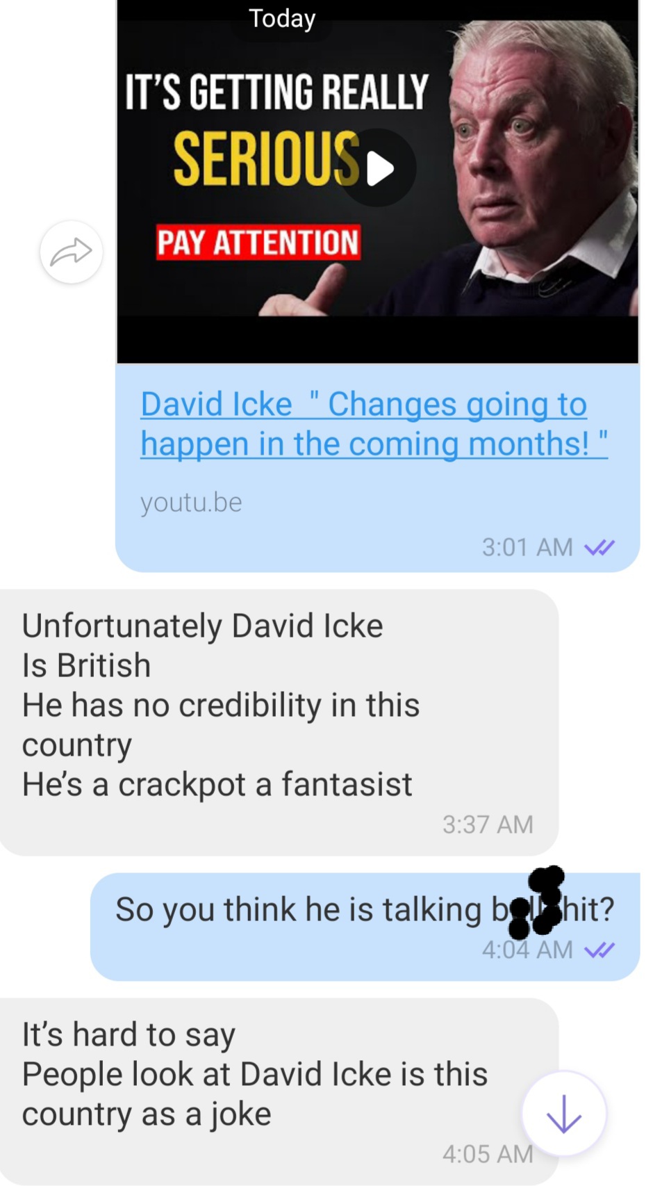 Вот, посмотрите хотя бы это, там 8 минут всего, я не смотрела, но он всегда одно и то же говорит. Дэвид Айк. Ещё 6 месяцев назад я бы сказала, что он распространяет конспирологические теории, но сейчас уже все маски сброшены и все что он говорит уже осуществилось - бизнесы разрушены, нас хотят поставить в зависимость от государства и системы. Лишить нашего личного дохода и дать взамен универсальный доход, лишить собственности, наличных денег, оболванить нас с помощью вакцин. Сделать из нас рабов. Ой незнаю....перекосы в кардинально одну сторону или другую как всегда крейзи. Истина где то посередине. Этот Айк же британец. У меня бф британец и мне было очень интересно узнать его мнение. Вот что он мне ответил Этот Айк и есть a joke Это надо крышей совсем поехать что б верить в его теории Как вам такое илюминаты и Рептилоиды "Icke believes that the universe is made up of "vibrational" energy and consists of an infinite number of dimensions that share the same space.[14][15][16] He claims that an inter-dimensional race of reptilian beings called the Archons (or Anunnaki) have hijacked the earth, and that a genetically modified human–Archon hybrid race of shape-shifting reptilians known as the Babylonian Brotherhood, the Illuminati, or the "elite", manipulate global events to help keep humans in constant fear. The Archons feed off the "negative energy" this creates.[14][17][18][19] He claims many prominent public figures belong to the Babylonian Brotherhood and are propelling humanity toward an Orwellian global fascist state, or New World Order, a post-truth era where freedom of speech is ended.[9"
