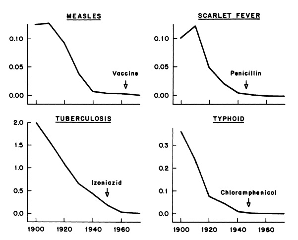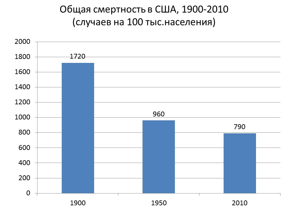 С учётом абсолютных цифр (доступны в приведённых источниках), несложно сделать вывод, что резкое снижение смертности с 1900 по 1950г. произошло за счёт почти 10-кратного снижения смертности от туберкулёза, почти 7-кратного снижения смертности от гриппа и пневмонии и многократного снижения смертности от желудочно-кишечных инфекций.