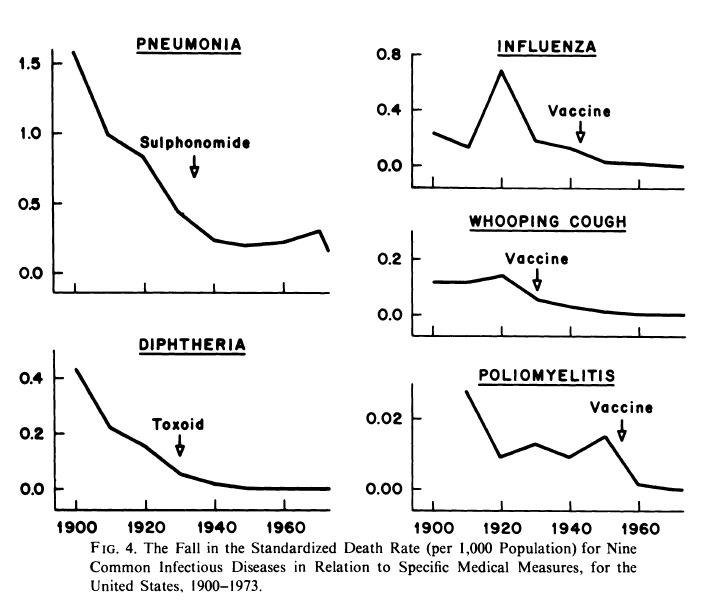 Из ВСЕХ вакцин и препаратов, внедрённых в практику в 1930-60е годы (против скарлатины — scarlet ever, тифа — typhoid, кори — measles, туберкулёза — tuberculosis, гриппа — influenza, коклюша — whooping cough, пневмонии — pneumonia, дифтерии — diphtheria и полиомиелита — poliomyelitis) лишь полио вакцина МОГЛА оказать некоторое влияние на смертность от соответствующей инфекции. Впрочем, навязываемая потребителям официальная точка зрения на этот вопрос игнорирует факты и здравый смысл и настаивает на преобладающей роли вакцин и химиопрепаратов в «победе над смертельными инфекциями».