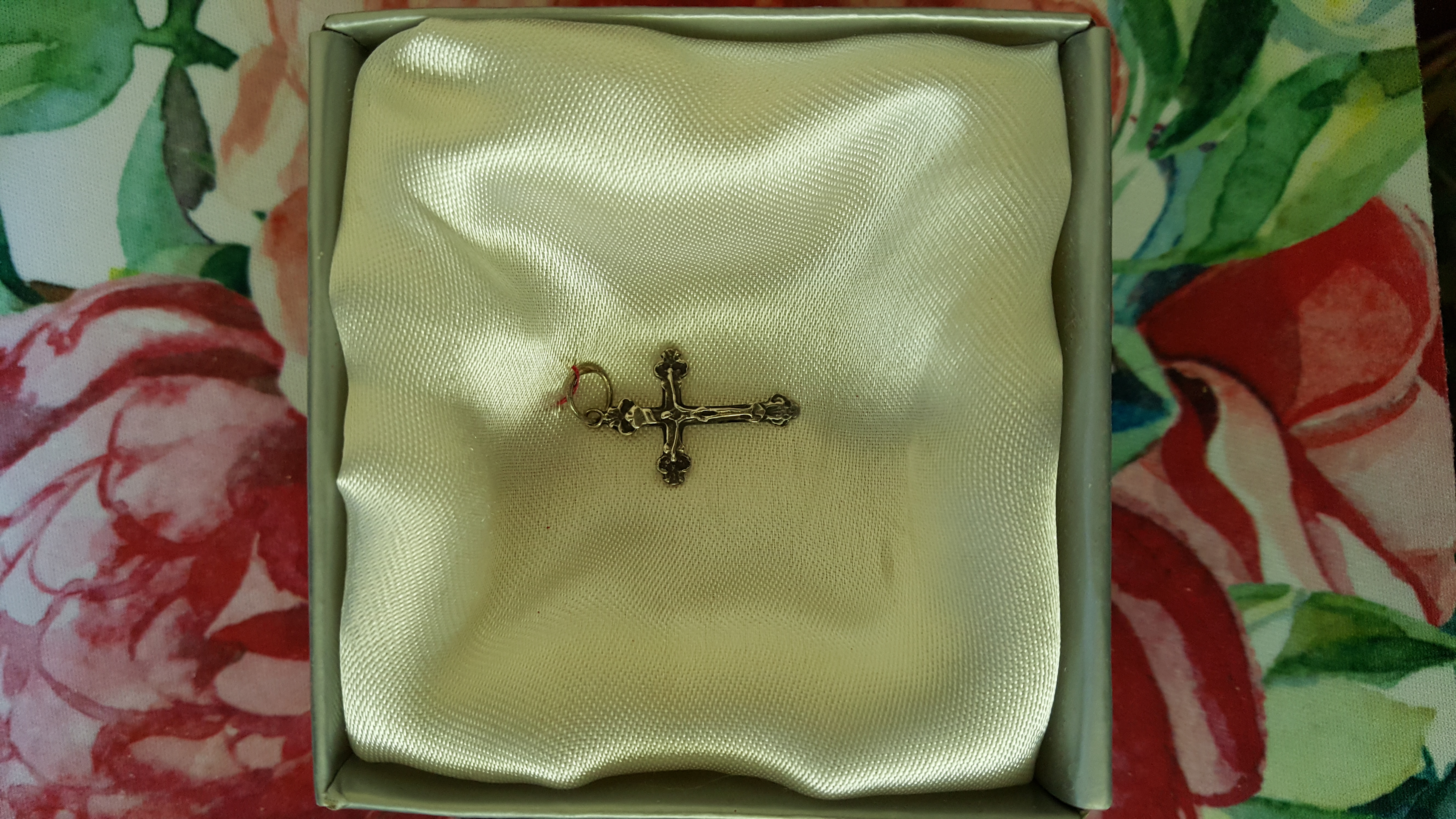 Вот мой маленький "драгоценный" крест. Я держу его в koробke. Я просто не осмеливаюсь снова надеть его на шею, потому что боюсь, что цепь снова сломается, и на этот раз я полностью ее потеряю.