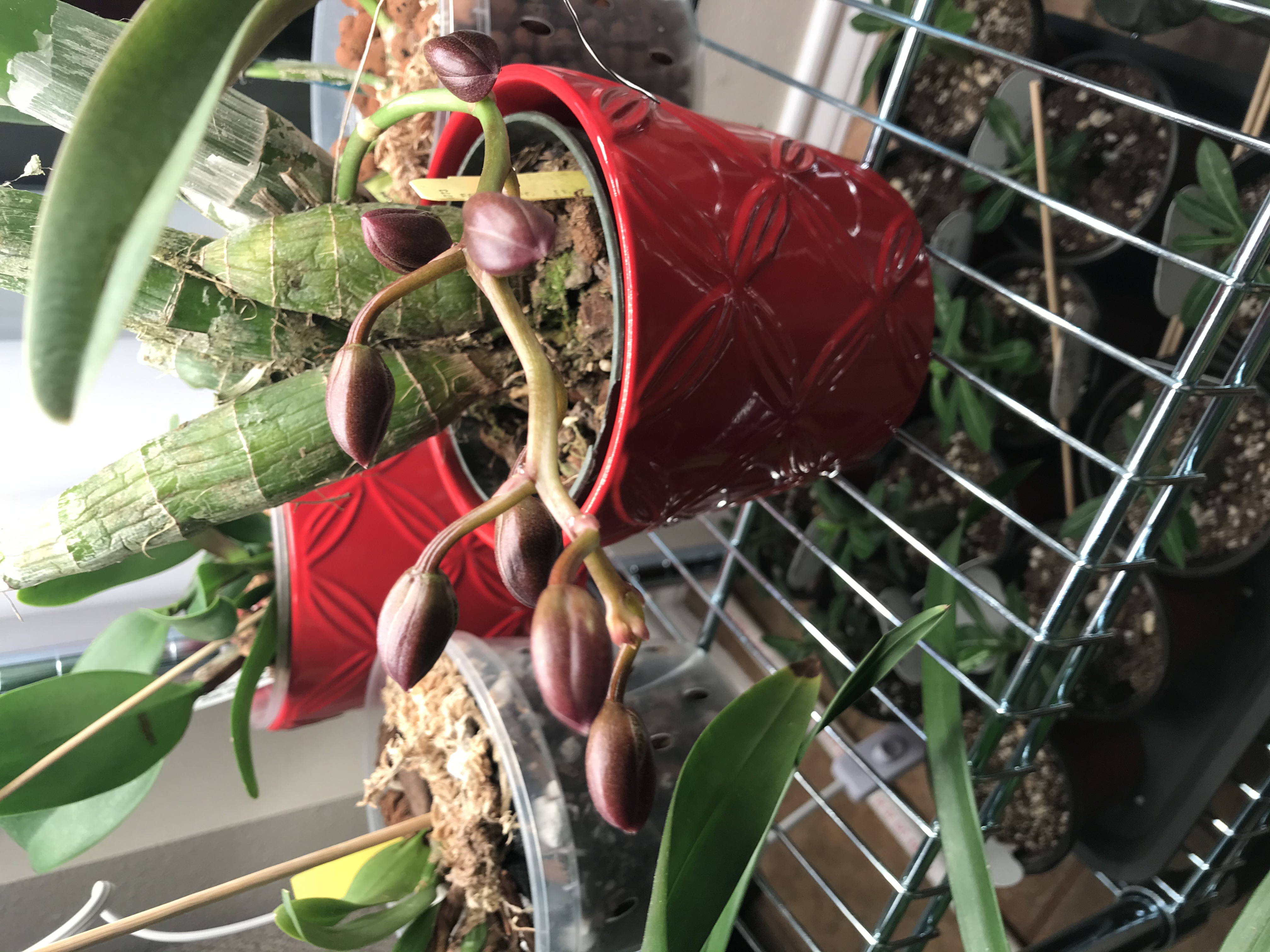 А я сегодня осчастливлена с утра! Новый онцидиум цветонос выпустил, интересно какого цвета, мне его подарили в орхомагазине, он у них в реанимашках стоял. И морковка распускается! Ей спать пора, а она цвести Три старых фала тоже цветоносы растят.