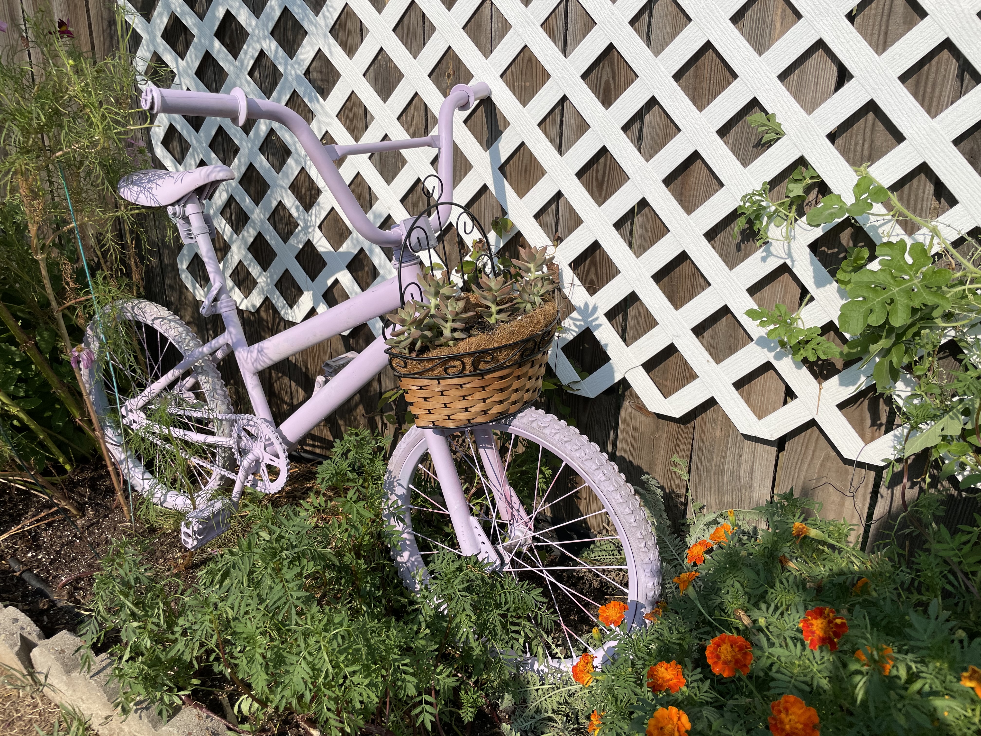 На последней посещенной гаражке обрыбился мне бесплатный велосипед  детских. правда, тоись не очень большой, но я все равно взяла. Халява же Давно нравились такие велики, используемые как декоративный элемент - можно с цветами в разных местах, можно просто как есть. Надо было щелкнуть до покраски, но я не.