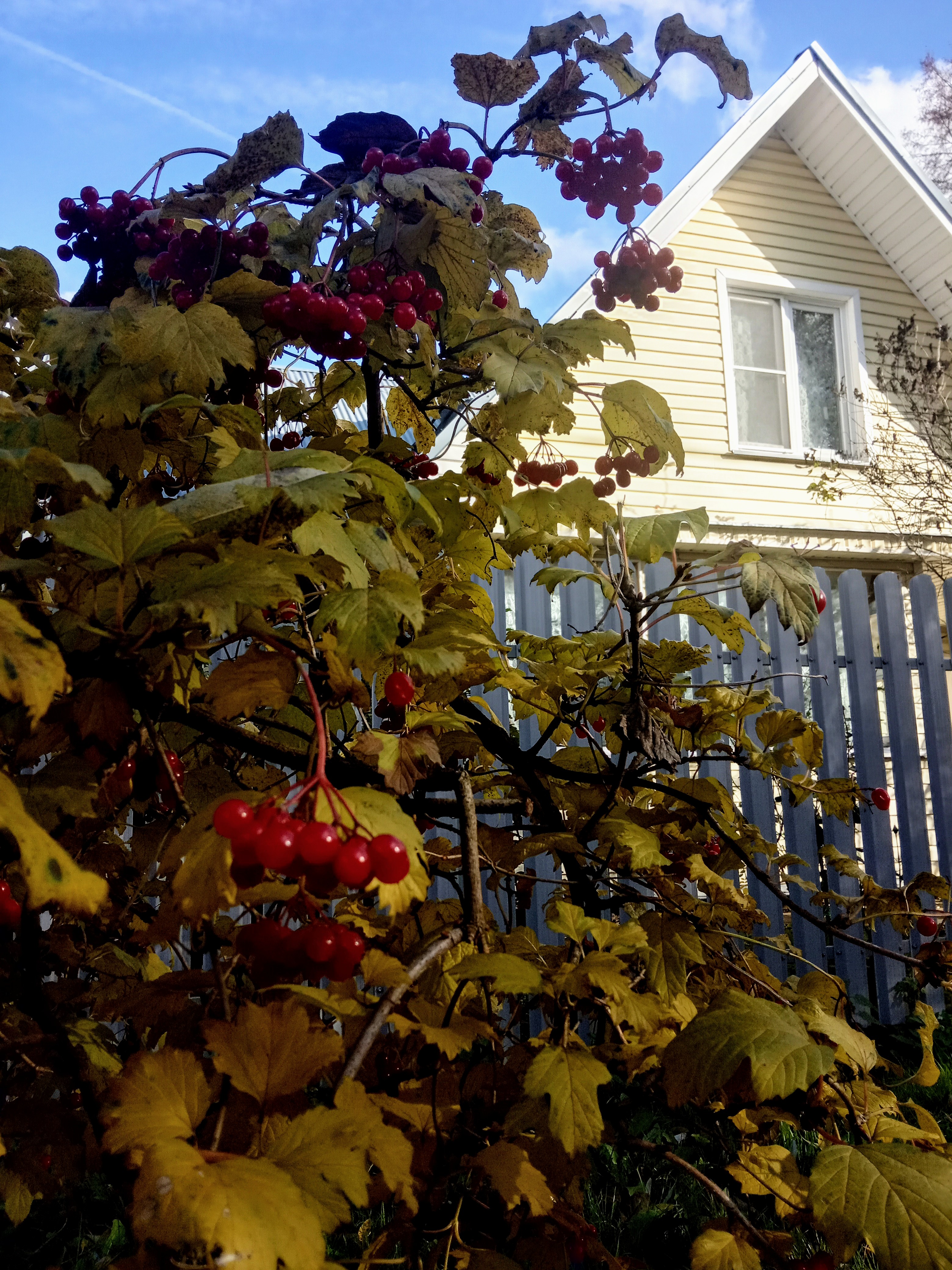 Учительница, Рябина не знаю какая, наверное обыкновенная. У одной красные ягоды , на второй оранжевые. Не знаю может сорт другой. А калина это не моя. Моя ещё маленькая, посмотрим.