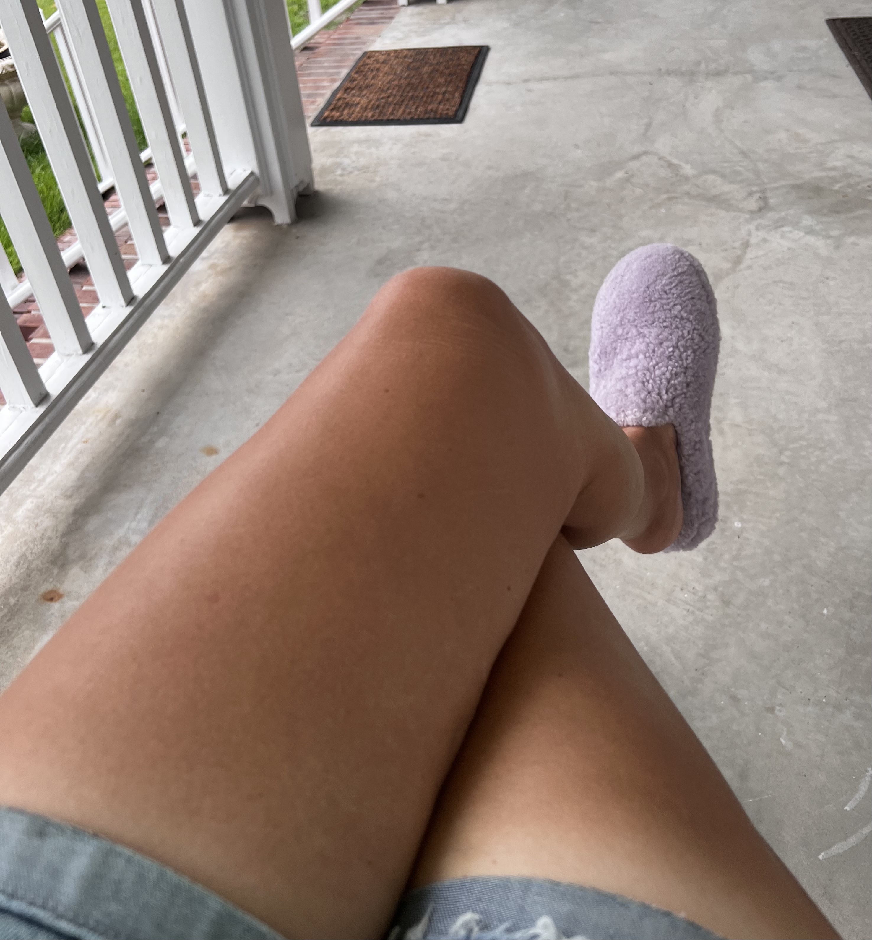 Прошла гроза, жара спала, сидим на порче с винишком. Демонстрирую огородный загар.  Вторая волна огурцов пошла, правда пока маленькие.