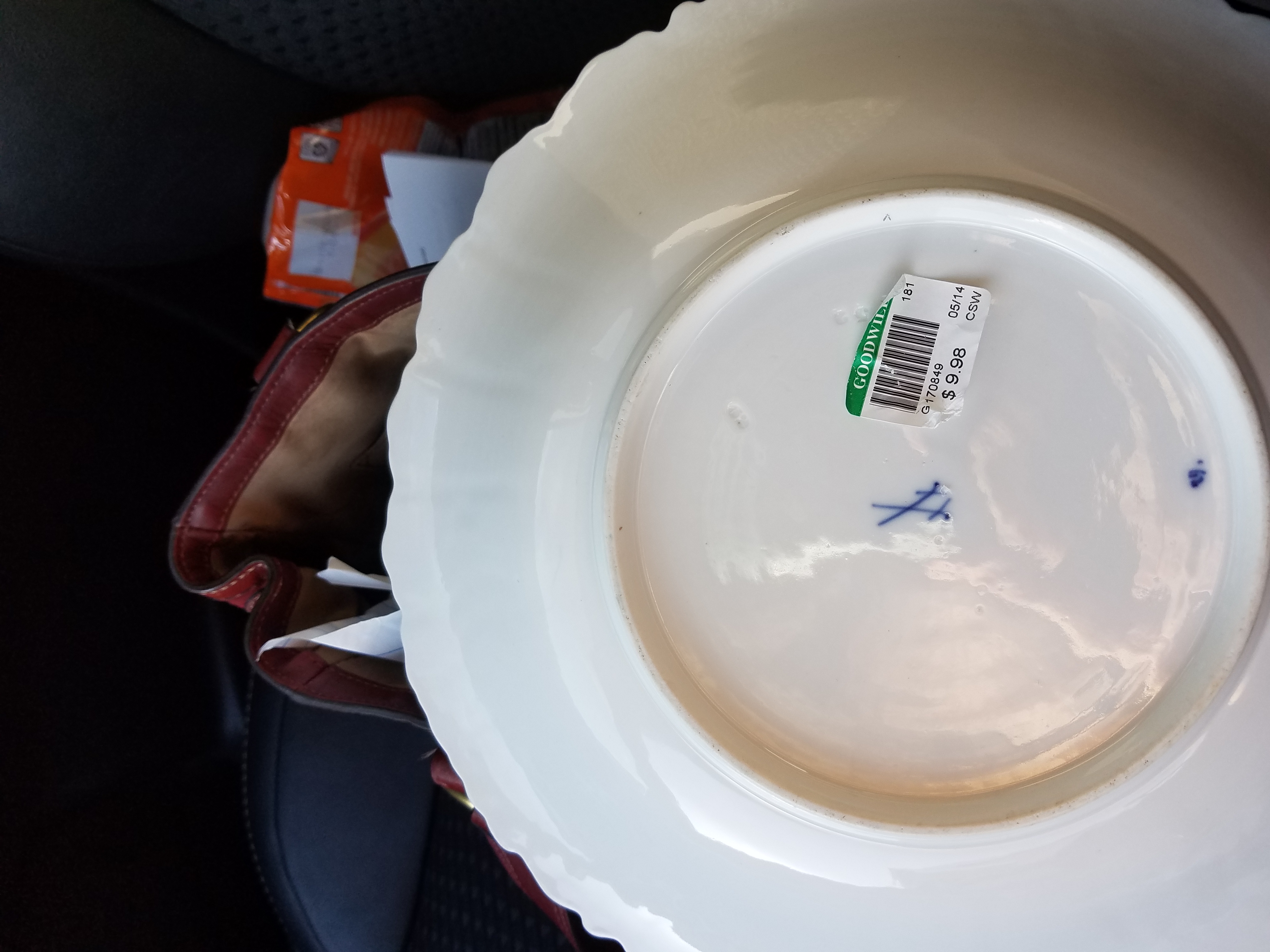 quote="Adolocha"] Déjà vu писал(а): Обратная сторона Офигеть!!! Вот это улов! Была в их магазине в Берлине, цены просто запредельные. VB по сравнению с ними- посуда для нищебродов (хоть я и фанат последней). Купила в том магазине чашечку с блюдцем, просто беленькие, без рисунка или объемов, что-то около $150, самая дешёвая пара, просто хотелось иметь.[/quote] Adolocha спасибо) я коллекционирую фарфор и, как и вы,тоже виллерой и бош очень люблю. Лет пять тому виллерой постоянно продавался в хоум гудс и тиджиках по смешным ценам. С тарелкой мейсеновской правда повезло.Не думала что мейсен может попасться в гудвилле. По клейму -это период с 1815 до 1924 года. Сегодня в обед поехала машину из ремонта забирать, а там гудвилл прямо по дороге, решила зайти на 5 минут и наткнулась на эту тарелку, я даже не сообразила что это мейсен. Ценник был налеплен на клеймо, я спешила и не стала отдирать ценник и клеймо проверять. Уже потом в машине посмотрела.