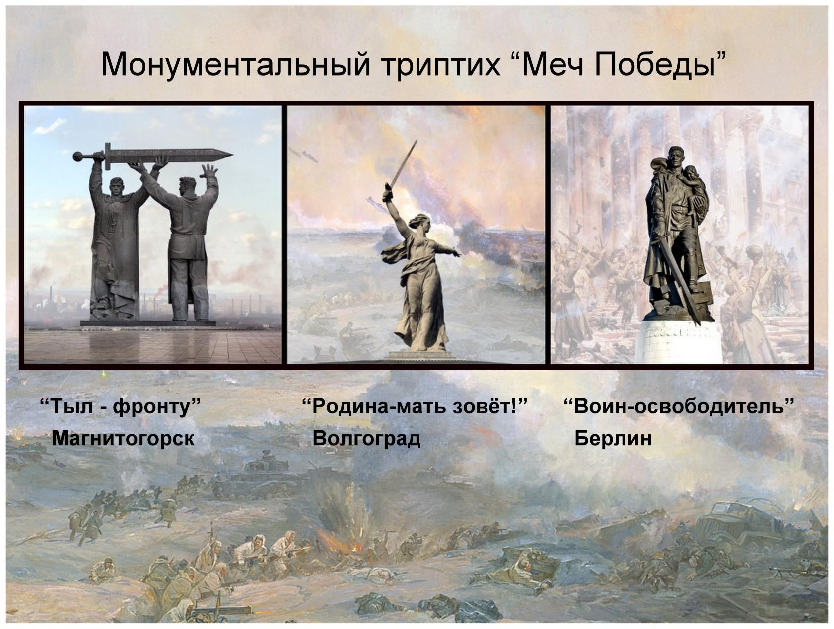 Мало кто знает, что одна из самых известных и высоких советских скульптур — «Родина-мать зовет!», которая установлена в Волгограде на Мамаевом кургане, является лишь второй частью композиции, которая состоит сразу из трех элементов. Этот триптих (произведение искусства, состоящее из трех частей и объединенное общей идеей) включает в себя также монументы: «Тыл — фронту», который установлен в Магнитогорске и «Воин-освободитель», расположенный в Трептов-парке в Берлине. Все три скульптуры объединяет один общий элемент — Меч Победы.