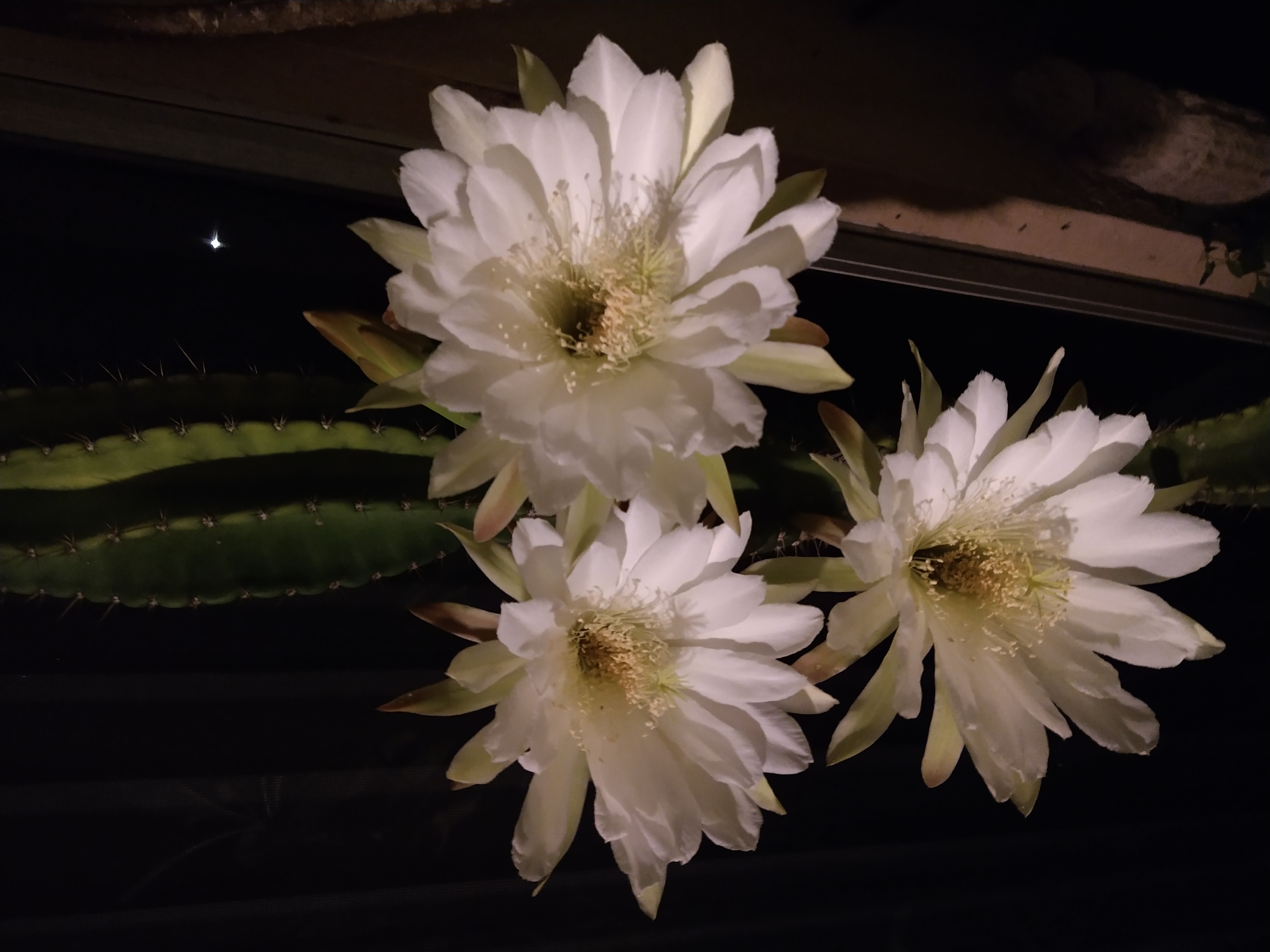 Ну и на бис. Больше 20 бутонов. Но цветет одну ночь. Сфоткала днём чтоб было видно сам кактус. Сейчас в темноте попробовала со вспышкой и без.