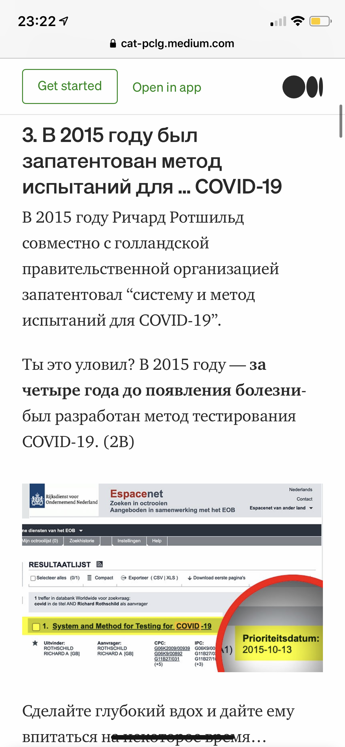 https://nl.espacenet.com/searchResults?ST=singleline&locale=nl_NL&submitted=true&DB=&query=covid+rothschild не могла не написать Про патент, priority date - это значит, что патент, который опубликован, ссылается на другие патенты, которые были выданы раньше. Самая ранняя priority date - это самая ранняя дата ссылки. на то, что ссылаются, необязательно то же самое, может, например, этот метод был использован для других вирусов, и его обобщили на этот. Как и в статьях/книгах, список литературы в конце - ессно, что даты раньше, ибо на то, что ссылаются авторы, было опубликовано ранЬше.. Спасибо за комментарий Хорошо дискутировать в приятной обстановке , без нападков .