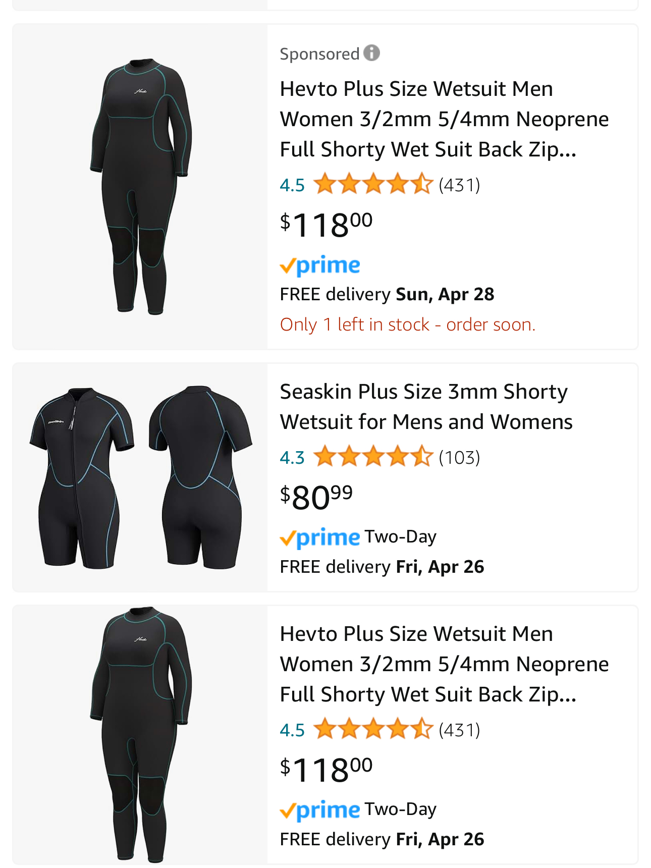 Тоже верно. Тут все бабки серфингистки сидят. Как выйдут в специальных костюмах с бордами- никакие волны не страшны.  На Амазоне, кстати, еще остались wetsuits plus sizes. Раззудись, плечо!