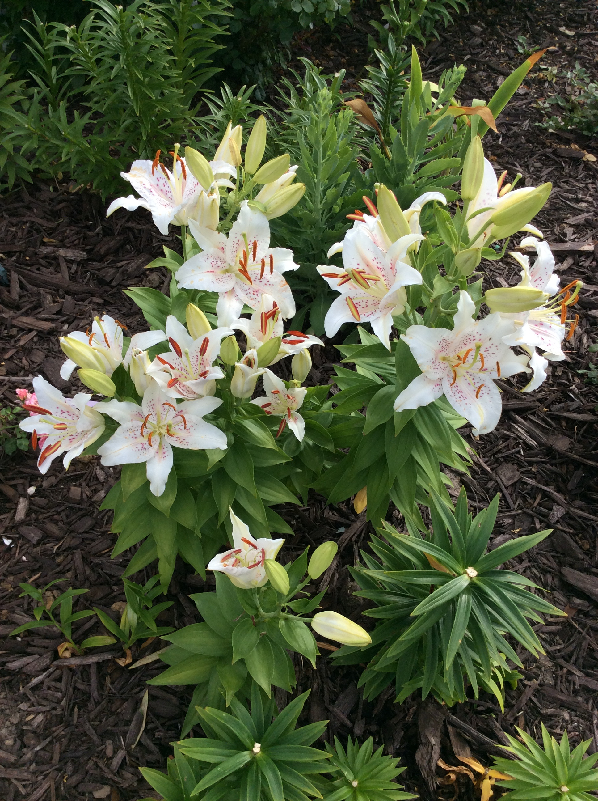 1. Единственная oriental lily которая у меня хорошо растёт в грунте. Сорт Muscadet. Зацветает позже всех. К сожалению, она не даёт бэбиков. Вот сколько луковиц посадила, столько и есть.