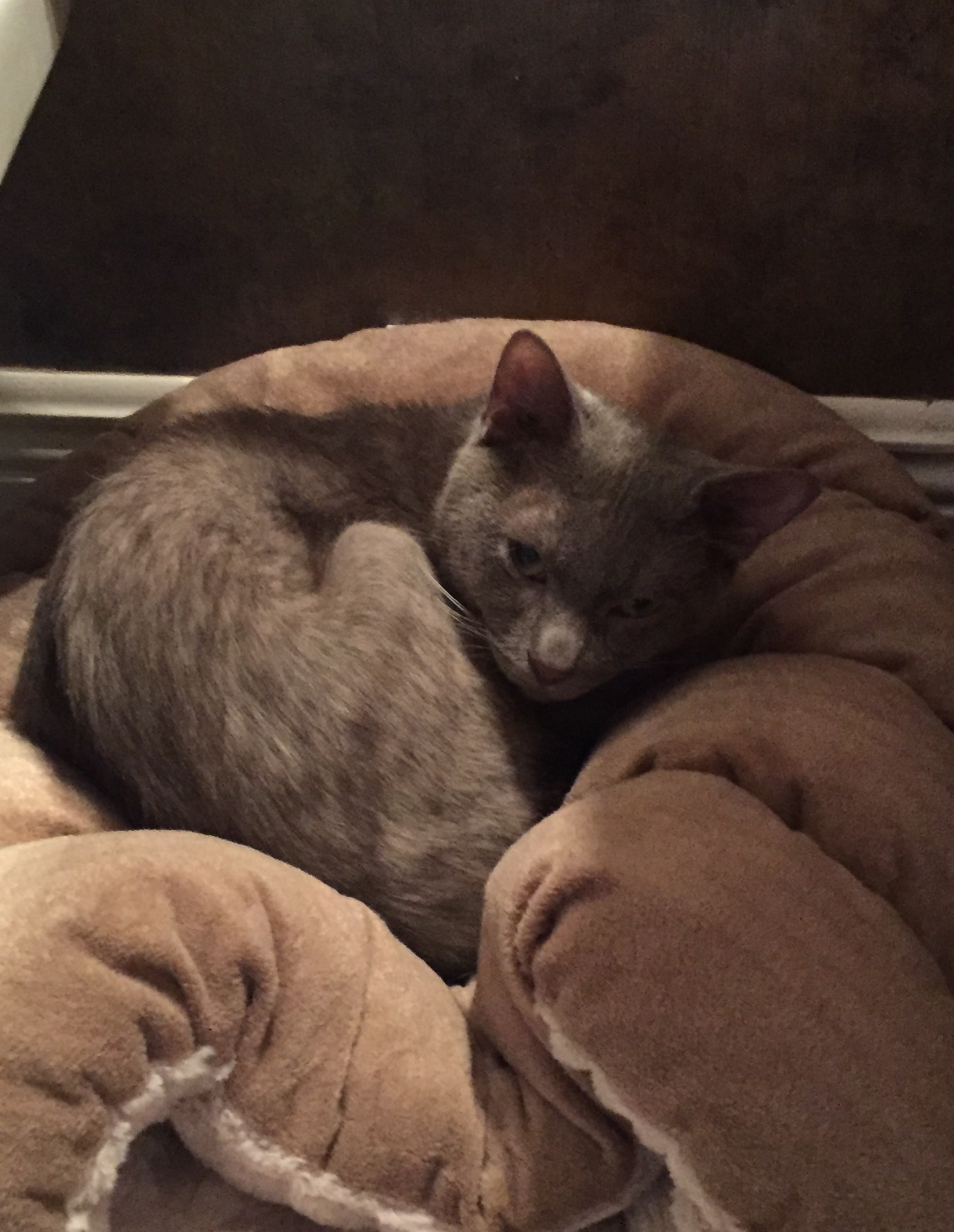 Джакси, у нас уже есть адоптнутые кот и кошка , не знай на кой вот ещё один. Забрала я его уже сегодня, фии шелторные только кешем , а я не знала. Пришлось тащиться в банк снимать 25 долларов :)). Пока будет жить в басрум,э и потихоньку знакомить наших. Страшилко- худюшка, выглядит непропорционально - голова взрослого кота, а тело котенка. На еду не набрасывается совсем, перекусит и отойдёт. Его в шелтер приняли 1 ноября, по идее должен был хоть немного отъестся уже. Может таким и останется?  Его побрили потому что шерсть была вся скатанная, хоть и короткошерстный, но он выглядит не как побритый, а как выщипанный, шерсть клочками жесткая, пуха мало, в основном остевой жесткий волос торчит. Он ещё такого taupe gray цвета, на крысенка похож. Его принесли из дома с многочисленными животными, может быть из hoarding house. После праздников идём к вету за планом как отъесться и привестись в порядок