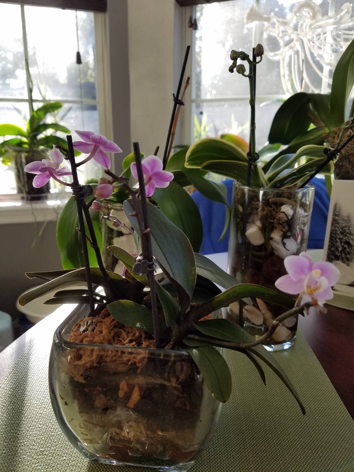 У нас вазы в волмарте дешевле чем в гудвиле. Слушай, а как мох в вазах живой поживает? Давно в вазах? Размножается? Фотки покажи, плиз. Год. Но тут такое дело. Мху нужна вода. Его надо сажать в самый низ или все время доливать воду. У меня он очень хорошо рос вдоль стен, но я уезжала на 3.5 месяца. В это время муж не поливал их. Я запретила, боялась что перельет. Только один раз немного добавил воды чтоб камушки на дне закрылись, но до мха не достала, он выше. Понятно что за это время мох засушился немного, но не до конца. Я замочила орхи, он ожил. Но потом я им устроила засуху, а то цветоносов не было. Вот сейчас все выпустили цветоносы и планирую на этой недели их всех замочить. Поэтому фотать нечего, мох пока маленький. Все же его надо на самое дно. Но у меня есть аквариум с орхами на улице, в нем дендробиумы, а значит много воды. Вот там мох хороший. Сейчас темно, завтра сфоткаю.