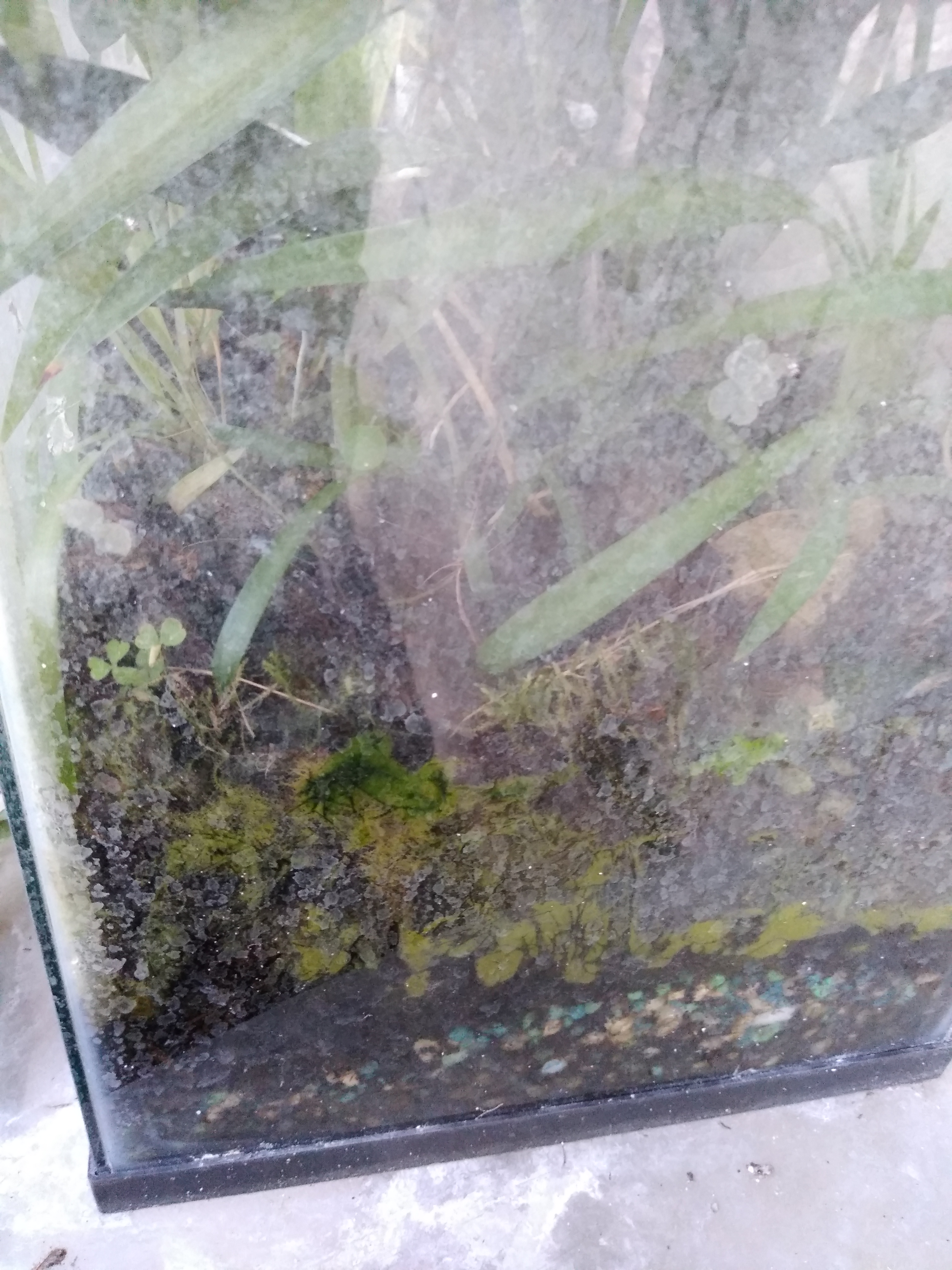 У нас вазы в волмарте дешевле чем в гудвиле. Слушай, а как мох в вазах живой поживает? Давно в вазах? Размножается? Фотки покажи, плиз. Год. Но тут такое дело. Мху нужна вода. Его надо сажать в самый низ или все время доливать воду. У меня он очень хорошо рос вдоль стен, но я уезжала на 3.5 месяца. В это время муж не поливал их. Я запретила, боялась что перельет. Только один раз немного добавил воды чтоб камушки на дне закрылись, но до мха не достала, он выше. Понятно что за это время мох засушился немного, но не до конца. Я замочила орхи, он ожил. Но потом я им устроила засуху, а то цветоносов не было. Вот сейчас все выпустили цветоносы и планирую на этой недели их всех замочить. Поэтому фотать нечего, мох пока маленький. Все же его надо на самое дно. Но у меня есть аквариум с орхами на улице, в нем дендробиумы, а значит много воды. Вот там мох хороший. Сейчас темно, завтра сфоткаю. Вставай, просыпайся! Ты проспала, забыла сфотографировать! Беги к соседям, зажигайте огни, разводите костры, включайте фары машин, ручные фонарики, но мох покажите! Нет, не забыла. Вот только фото не получается. Видно одно грязное стекло, хотя на самом деле оно не такое уж и грязное. Сверху не сфотографировать, там все заросло. Сам аквариум мне не сдвинуть, он тяжёлый, там камни на дне. И стоит в углу, там света мало. Вот смотри что получилось. Там виден мох но не очень. Попрошу завтра мужа сфотографировать у него камера на телефоне лучше.