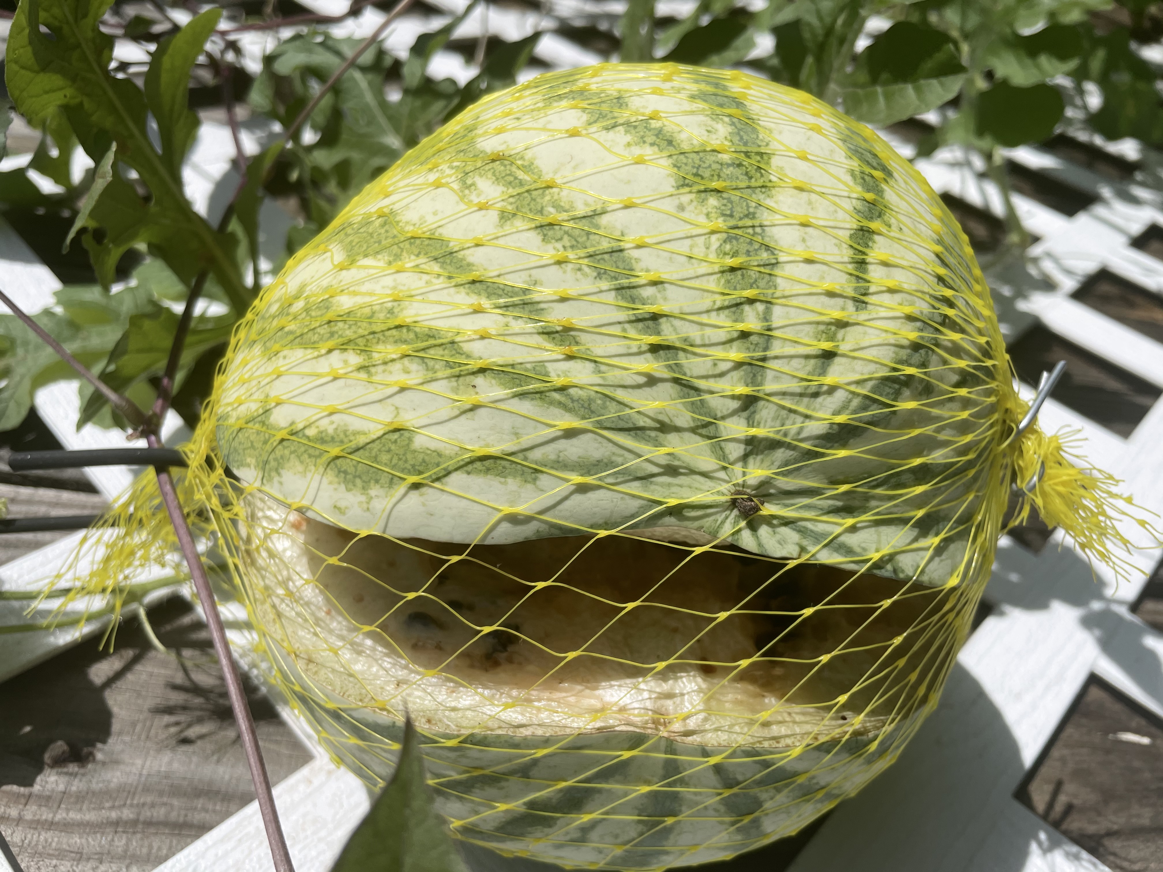 Учительница, сладкий Ананасий?  на вид прям мед! у меня тоже урожай...и тоже желтый В целом ему, наверное, и было чуть больше месяца... Но какого хрена лопаться-то... наверное, не сегодня - разлоп заветрился и начал слегка пованивать. Однако все же решила заглянуть, че там внутри - семечки-то явно зрелые, почему же ниразу не красный? Прямо скажем - даже и не розовый. Срезала заветренный край, и оказался вполне себе сладкий он...но желтый. 2250 г. Sugar baby - он ведь красный? или я такой вот себе дальтоник... А кузнечик так живописно выглядывал из-за забора и потирал лапки вполне себе злорадно - наверное, хихикал над моим печальным видом