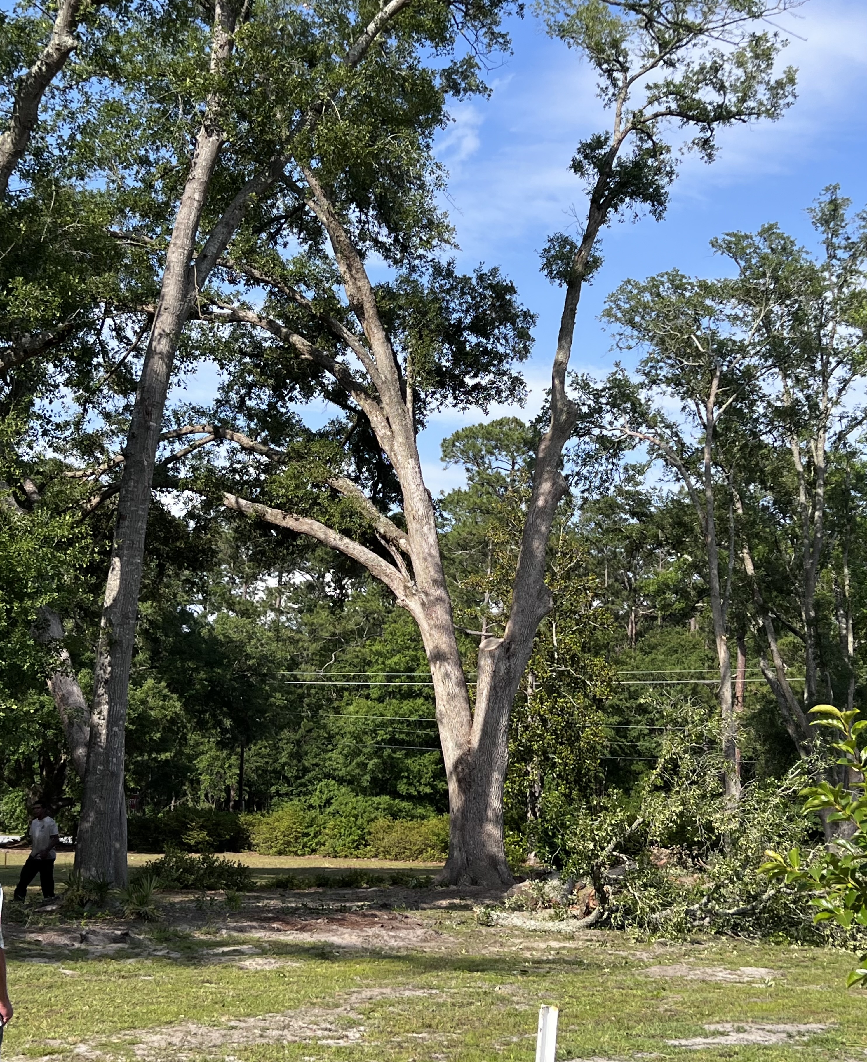 Сегодня приезжали к нам с корзиной- спиливать нависающие ветки. Мой хочет еще один ряд плодовых пустить. Мужики знают, что делать. Пилой на высоте так лихо орудуют. Вот только одно, до и после.