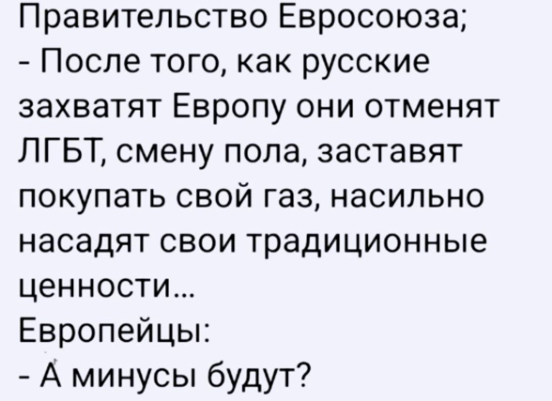 Цитата: просто интересно на фоне воплей из Прибалтики, что русские якобы исчезают Чья бы корова мычала  В Прибалтике народу практически не осталось. Жить нечем, производство развалили, шпроты повыловили и разъехались по Евросоюзу. Остались только бюрократы, которых Брюссель кормит.