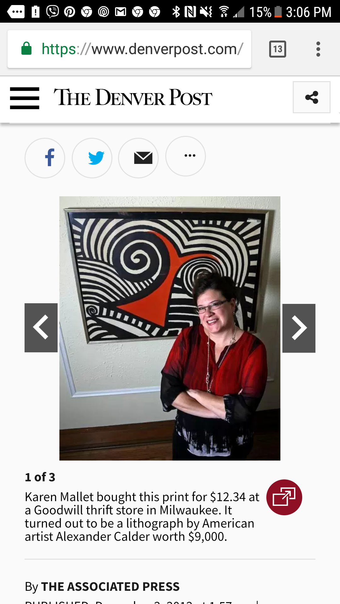 ALIEN писал(а): отдать 9 тысяч за литографию, на каких она медикейшен сидит? пусть мне позвонит или мартине я ей этих полосок под линейку тысячу начерчу, это как сотбис, сам себя раскручивает и сам у себя покупает, а, кастрюли, если это стейнлесс, и не магнитят метал, конечно стоящая вещь Тетка за 12 баксов купила в гудвилле, продала за 9 тыщ. Это за литографию. А оригинальные его работы за миллион уходят. In 1995, Jon Shirley (the former president of Microsoft and a Calder collector) purchased Two White Dots for $1 million.
