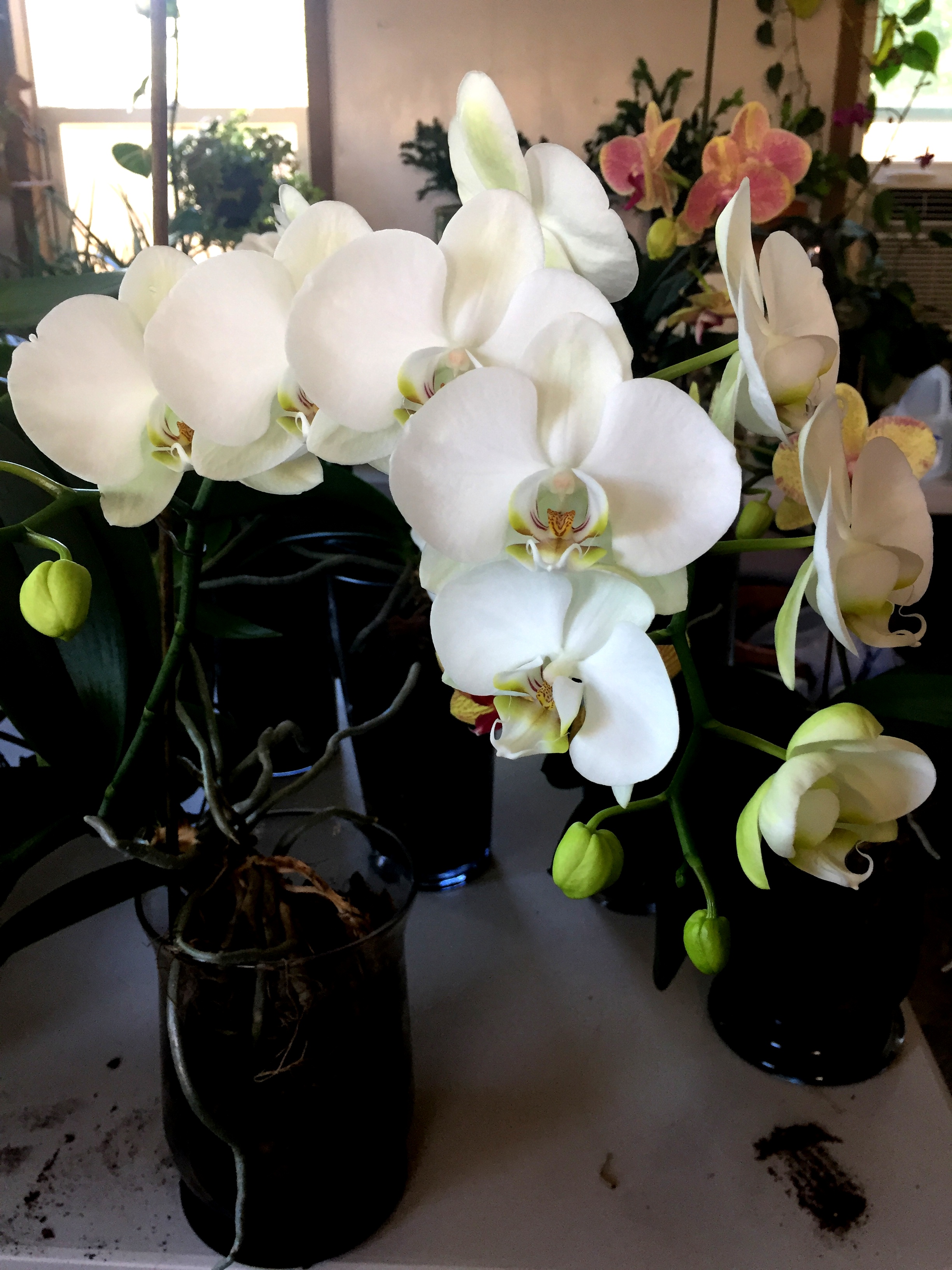 OklaXoma писал(а): Да  у нее Да у нее все по две навыдавали. Адолоча, уточни, что ты им шептала? Про подгузники не надо - не у всех они в наличии с нужным содержимым. Ну не все, а 80% орх выдало по 2 стрелки. И на многих из них ещё куча разветвлении, на тех, которые мультифлоры. Но даже обычные орхи в этом году молодцы, да по 2 стрелки. Что нового в этом году, что сподвигло их к буйству? Почти все старое, но. 1. Прошлым летом убрала их с глаз долой в гараж. На западное окно. Куча света с обеда. Не притеняла. Дала бы и южное или юго-западное окно, но было только западное. 2. С лета и до почти полного роспуска там и сидели. То есть закладка всех цветоносов шла в гараже. А там перепад ночных температур. Ночью там было 58ф (ниже у нас не падает в гараже даже без обогрева), а днём могло даже зимой подняться до 80. Плюс машина тепло отдавала. Вот ещё думаю, может им газы нравятся? 3. Прошлым летом срезала абсолютно все стрелки под корень, секатором, почек не оставляла. 4. Сидят в вазах, никаких потных пяток, кубиков льда и тд. Поливала, когда вспоминала. Иногда вазы высыхали полностью. Тогда могла налить и до трети воды. Вода из под крана, не отстаивала. Добавляла удобрения, которые были ближе к крану. Разные миркл гро, для цветения, для кислотных. Что было. 5. Оклахома, это единственные растения, которые сидят без памперсов. Традиционно сажаю их в шишки, которых море и бесплатные. Эти орхи были посажены ещё в аризоне, шишки тамошние, не меняла их ещё. 6. Заметила, в тесных вазах цветут лучше, видимо, как и фиалки, им надо корнями освоить все пространство. 7. Не брызгаю, не удобряю по листу, чеснок не добавляла. Цитокинин не использовала. Ламп и увлажнителей воздуха у меня нет.
