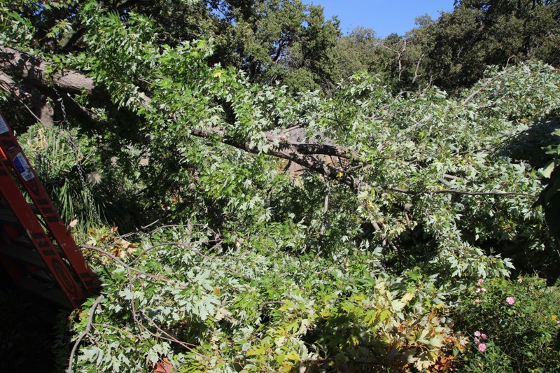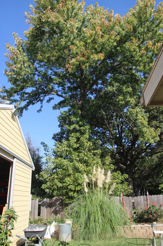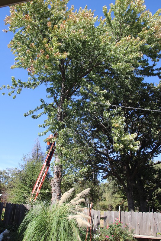 Покажу наши древоуборочные работы. Был огромный клен, три ствола. снизу один ствол. обхватить можно втроем. зараза вечно обрастал еще снизу здоровым кустом. опять же с него вечно все валилось, целыми ветками, а ветра часто. Высотой с пятиэтажку. Говорила мужу еще до постройки шеда - убрать бы, мало ли что, упадет - мало не покажется . Муж разводил руками - фиг уберешь, там места нет, три участка под ним, заборы, то-се. Никакую технику не подогнать опять же. Построил шед. Поставил солнечные панели на него. И вот теперь, когда реально стало получить дорогостоящие руины - решил спилить  Забор, видишь ли, старый не страшно обрушить. Вобщем, вот кактотаг. Зато теперь забор передвинется метра на три глыбже, будет место что-нить подсадить. Делай раз! Делай два! получай)