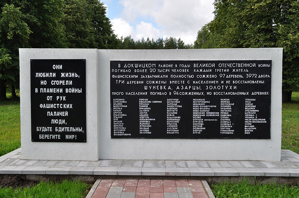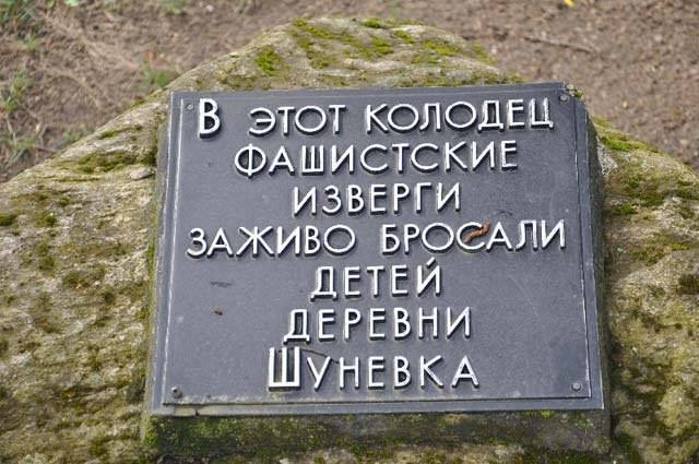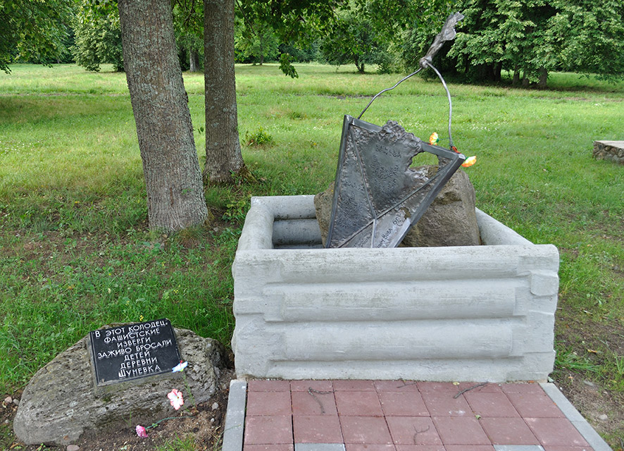 22 мая 1943 года от рук немецких карателей в деревне Шуневка было сожжено 66 мирных жителей деревни... Стариков фашисты жгли в сарае, а детей кидали в колодец. Вот кого они замучили: Ананич Люсю — ей был 1 год, Кирвеля Мишу — 2 года, Ананича Володю — 2 года, Ананич Люду— 1 год, Коляго Володю — 4 года, Рутковского Петю — 5 лет... А всего— 15 малышей. На месте колодца, куда были сброшены дети, был возведён бетонный колодезный сруб, в котором помещена бронзовая скульптура пробитого и обожжённого воздушного змея с именами погибших детей. Обожженный воздушный змей – символ оборванной детской жизни. Ему уже никогда не взлететь в небо... В июне 1979 года был открыт мемориал по инициативе жителей соседних деревень, которые хотели увековечить память погибших из Шуневки и сожженных деревень Докшицкого района. Мемориальный комплекс, созданный народными художниками А.А. Аникейчик, Л.М. Левиным и Ю.М. Градовым получил название «Проклятие фашизму».