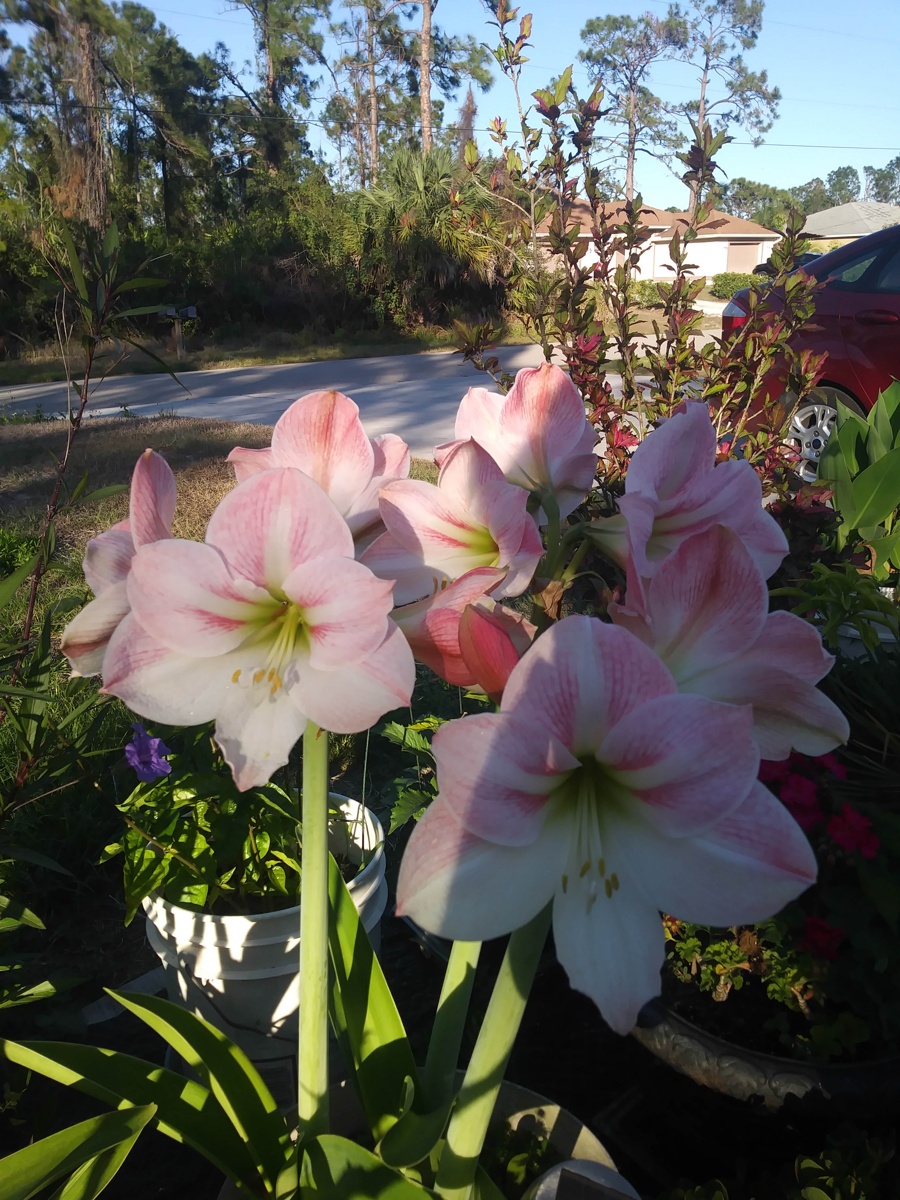 Baylee писал(а): Мамик, амариллис и декабристы отпадные  Я на амариллисы кошусь, но хватает сил не покупать... у нас январь впереди и возможны фросты. Как тебе удалось такие декабристы вырастить? Я по ним не спец, но заглядываюсь. Вроде им прохлада нужна перед бутонизацей... как ты им прохладу обеспечиваешь?  У меня все на улице круглый год. Если и бывают заморозки то это пару ночей за зиму да и то не каждый год. Тогда приходится затаскивать в дом и гараж. Для декабристов я методом проб и ощибок вывела правила. Держу их на северной стороне дома. Никакого солнца. Может только летом слегка утром. Держу под навесом. Чтоб летом не заливало водой, а зимой росой. От холодной росы цветы чернеют. От влаги корни сгнивают. Перед цветением стараюсь минимально поливать, дать им немного посохнуть. К ноябрю у нас уже появляется ночной перепад температур. Видимо этого достаточно. С амарилисами вообще все очень просто. Они у нас на газонах растут сами по себе. У меня в горшках. Сейчас, зимой, не поливаю. Роса, если дождик вдруг, этого достаточно. При заморозках не убираю. В конце осени срезаю листья и так стоят до весны. Цветут в конце февраля, начале марта. Как проклюнулись стрелки, так начинаю поливать. Вот прошлого года фото