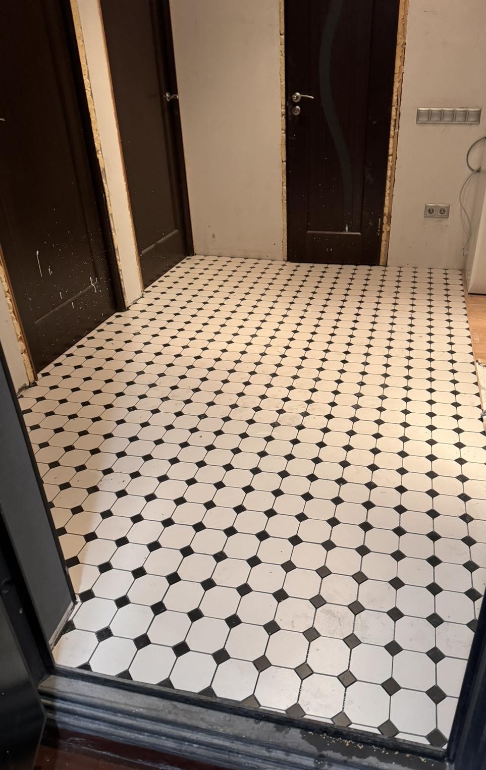 Дочь сделала теплый пол в прихожей. Мне прямо очень нравится. Двери будут белые в французском стиле со стеклами.