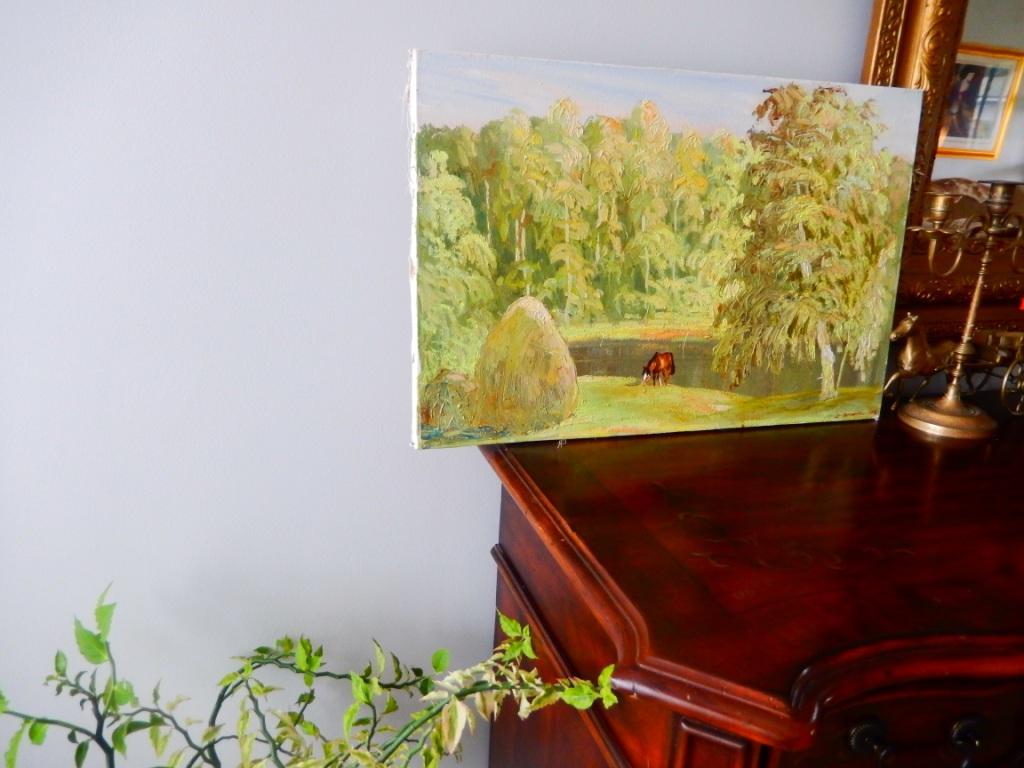 Стены украшаю тем, что вызывает какие-то чувства-воспоминания.  Фотографии личные не люблю вешать, ставить. Так как у нас были лошади и я их очень полюбила присутствует "лошадиная" тема. Картину-пейзаж, довольно известного российского художника,очень люблю. Только вот рамку надо подобрать. Деревянная картина, из Коста Рики. Она, как 3 Д.Очень интересно вырезана изнутри.