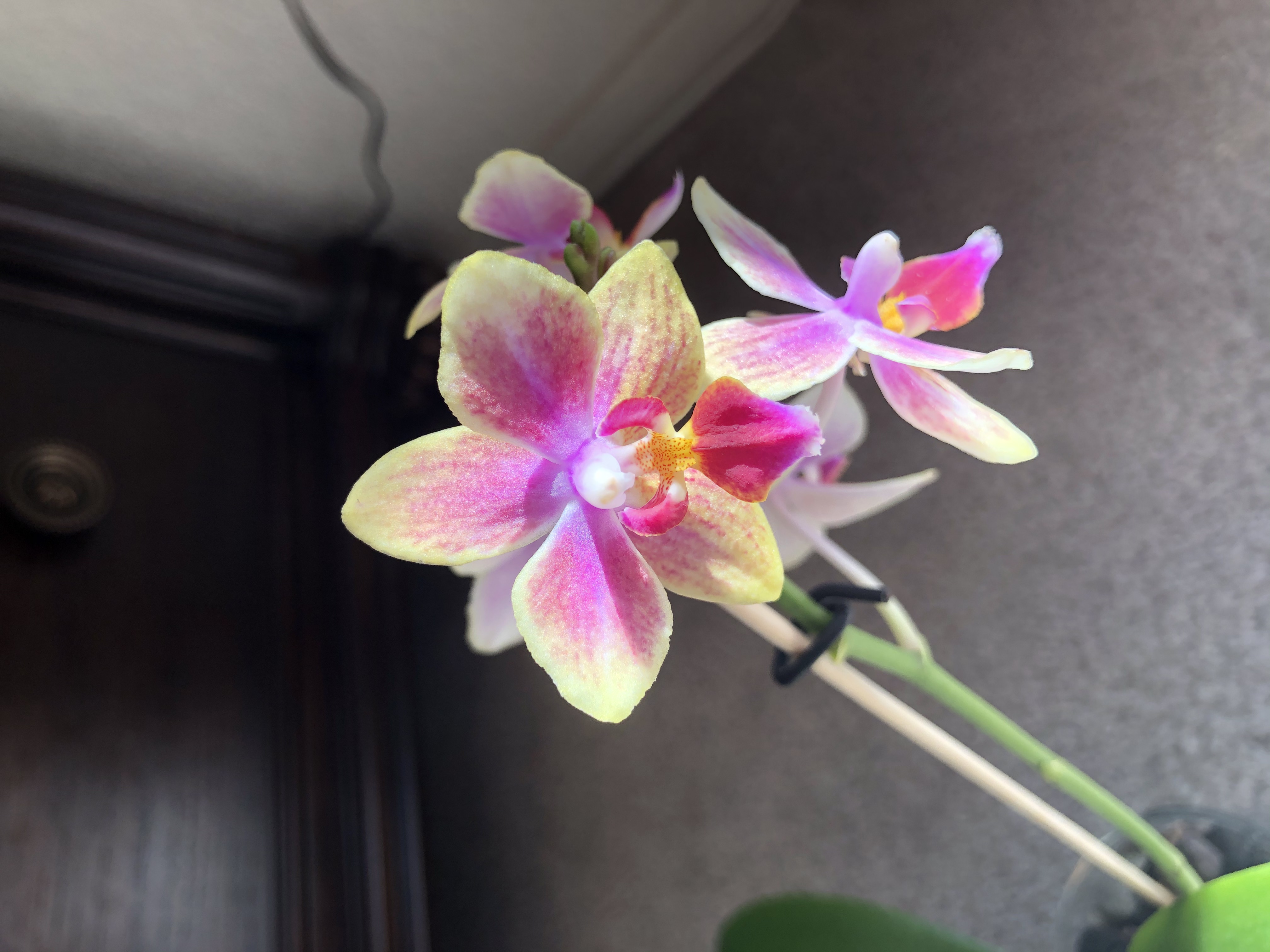 Ещё своего арлекина покажу, уже в дневном свете. Нравится мне он все больше. Это его первое магазинное цветение, старается. 10бутонов, цветы около 4 дюймов.
