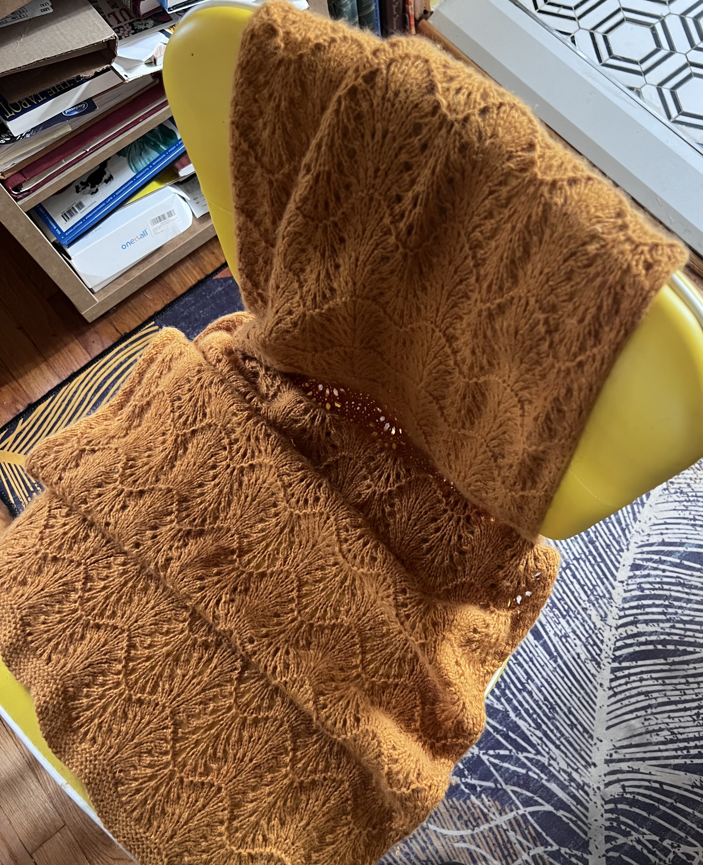 Довязала шарф из какого- то пуха, получился целый палантин, его и повяжу на шею, в России уже прохладно.))