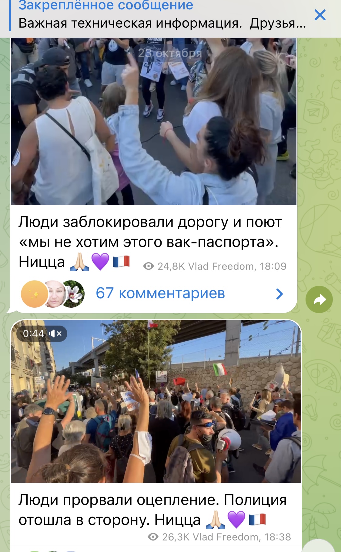 Шапокляк100 писал(а): Амалька, я почему вопрос задала - где ты... Европа и США нафиг никого непривитых не впускают. Плюс, не знаю у кого как, но собрала сведения из первых рук (включая свой собственный опыт), что после этих мифических прививок, имунная система принимает только лекарства той страны, где прививка получена. Может, конечно, это какие-то. временные побочки. У знакомой сын живет с семьёй в Германии. Там вообще какой-то усиленный карантин ввели. Короче, ни он в гости не может приехать, ни она к нему. Сын айтишник, жена в банке типа CPA работает. Сын говорит, что выпихивают по-тихоньку айтишников с работ. Сша пускают непривитых граждан по пцр пока еще . Но я пока и не собираюсь возвращаться . В Европе большие протесты . Против вакцин и ветеринарного паспорта . Это показывают по тв в сша? В России нет, тишина: А на телеграф каналах видио огромных протестов по 5-10 тыс и больше человек каждый почти день .