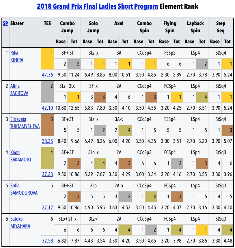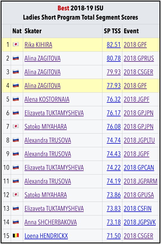 У Алины отобрали ее главный козырь - все прыжки во второй части. Понятно было, что при чистом прокате Кихиры Алине по большому счету противопоставить ей нечего, она сделала все, что могла на данный момент. Алине можно увеличить базу только переносом каскада во вторую половину. А в произвольной у Рики два тройных акселя и ,насколько помню, два лутца. Разница между двойным и тройным акселем 4.70.