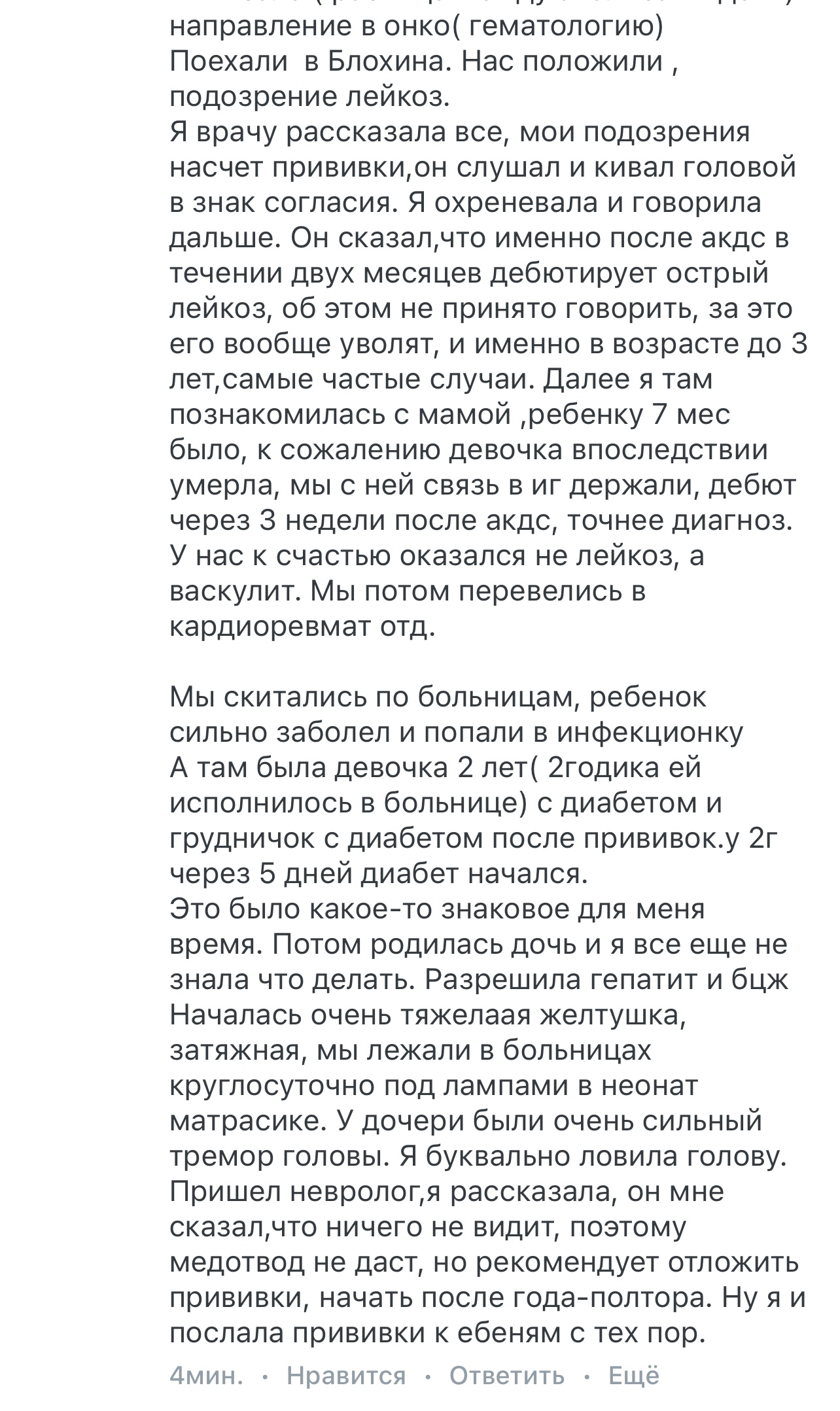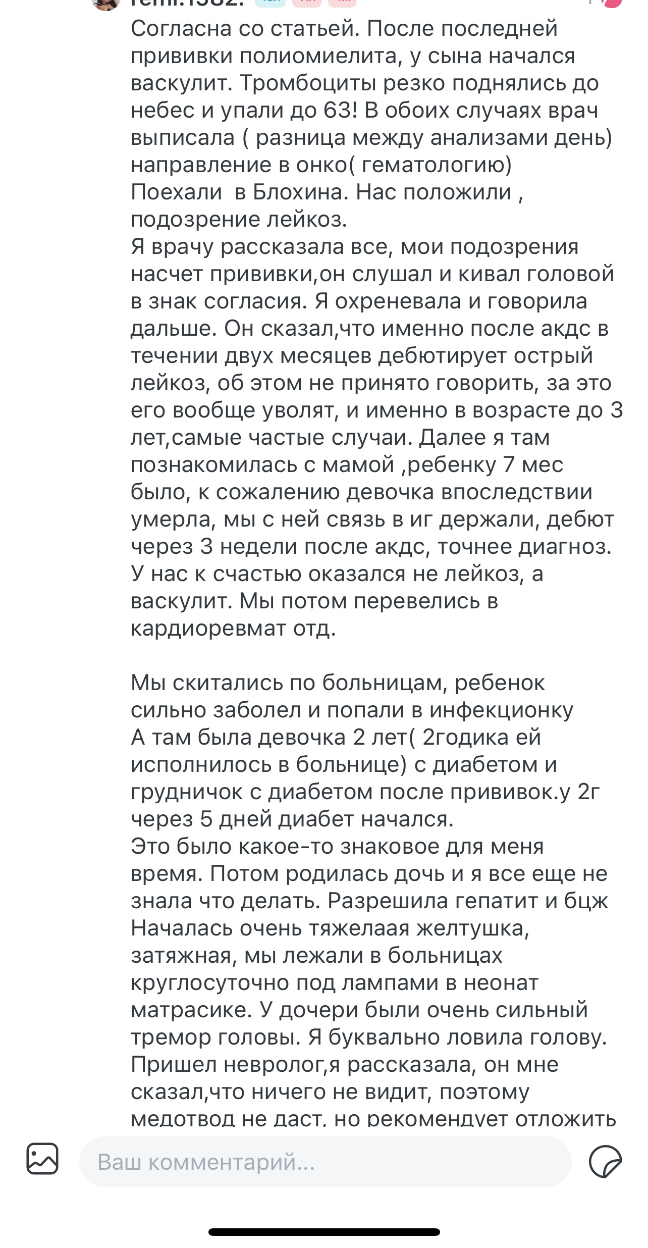 suslik писал(а): Amalia_Ca писал(а): Olimpiada77 писал(а): Амалия, так эта женщина пыталсь жаловаться, в суды, или же в министерство здравоохранения России? Кто то да , кто-то нет. В России вообще невозможно ничего доказать, поствакцинальных осложнения регистрировать отказываются. В России официально регистрируется только 400 поствакцинальных осложнений в год, в реальности статистика ужасающая. Эксперты говорят что она занижена где-то в 100 раз. То есть не 400 осложнений в год а скорее 40 000 осложнений в год. если бы ето было правдой, каждый третий бы был скрючен в дугу, а люди продолжают жить обычной жизнью.  Какая ты наивная… В России сейчас у каждого 32 го аутизм. Острый лейкоз никогда не был так высок среди детей. За всю историю. В стране эпидемия детской онкологии. Только в 2018 году такой диагноз имели почти 27 тысяч маленьких пациентов. В отчётах Росстата на сто тысяч детского населения в возрасте от рождения до 14 лет в 2018 году приходилось 468,5 пациентов... Ссылка на цифры: https://amp.rbc.ru/rbcnews/rbcfreenews/5d4c6c0c9a7947bd06eb4b4f Невролог Головач, привел статистку. Из 1500.000 детей в России , здоровы только 59% 41% больны и очень серьезно. Это аутизм, ДЦП, рак, Астма, Сахарный диабет , эпилепсия …. Тебе мало 41%? Так что Сусик , ты застряла в 1980х Я тебе указываю на реальную статистку на сегодня.