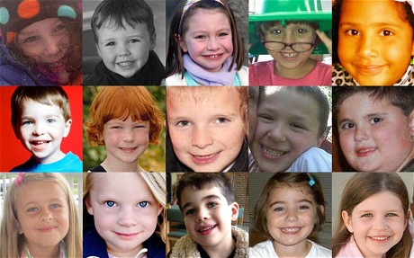 Цитата: (Top row from left) Charlotte Bacon, Daniel Barden, Olivia Engel, Josephine Gay, Ana Marquez-Green. (Middle row from left) Dylan Hockley, Catherine Hubbard, Chase Kowalski, Jesse Lewis, James Mattioli. (Bottom row from left) Grace McDonnell, Emilie Parker, Noah Pozner, Caroline Previdi, Jessica Rekos